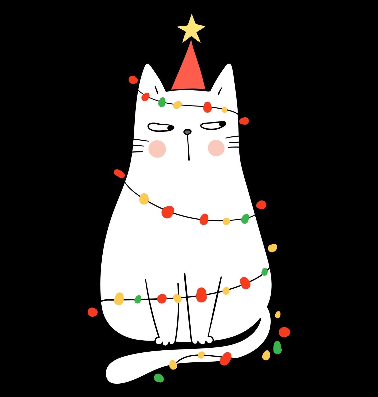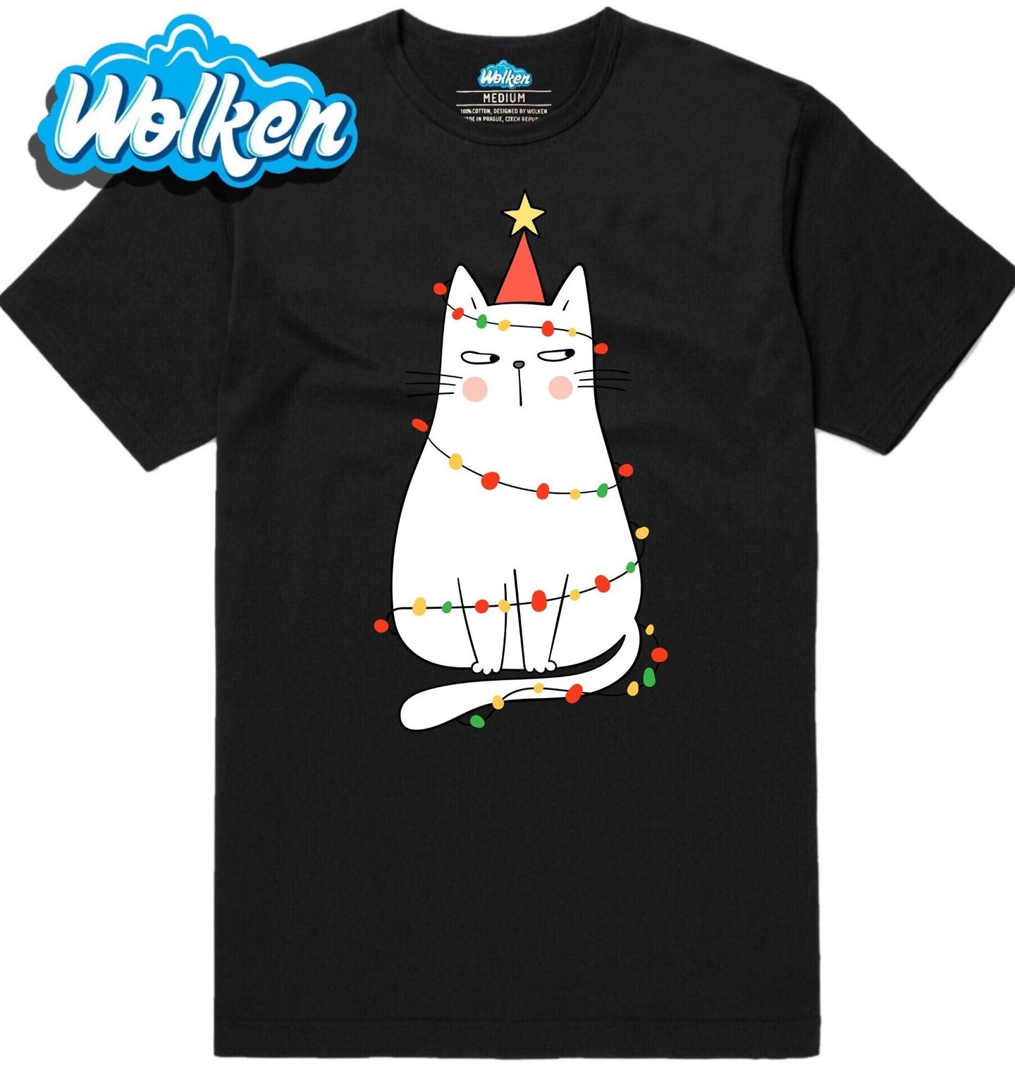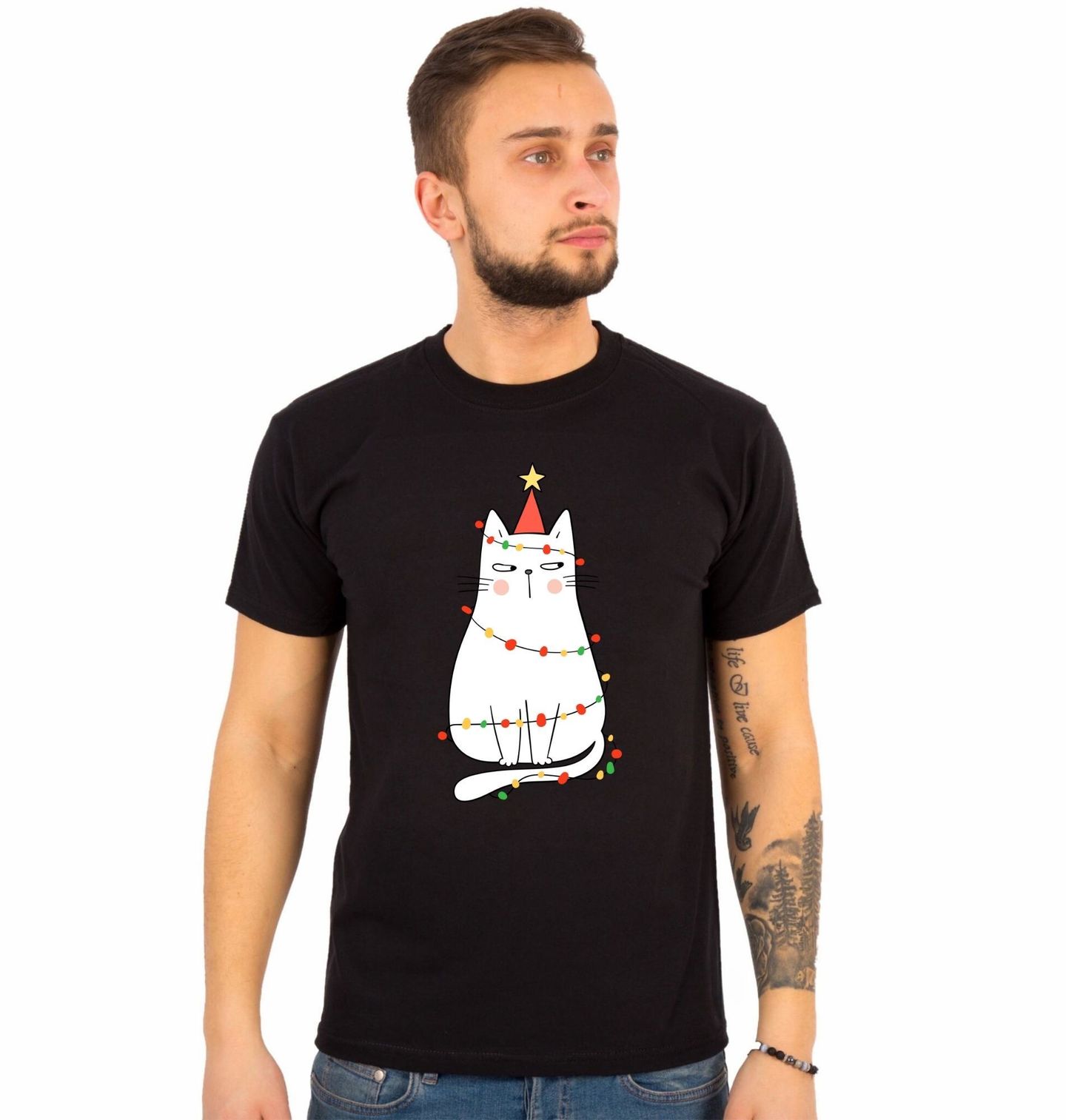 Pánské tričko Ozdobená Vánoční Kočka. Tahle kočka měla o svých Vánocích úplně jinou představu… Omotaná světýlky, s čepicí na hlavě a výrazem „nechte mě být“ – to je vánoční realita, kterou každý milovník koček pochopí. Pokud miluješ sarkasmus, Vánoce a kočky, tenhle motiv tě rozhodně pobaví.