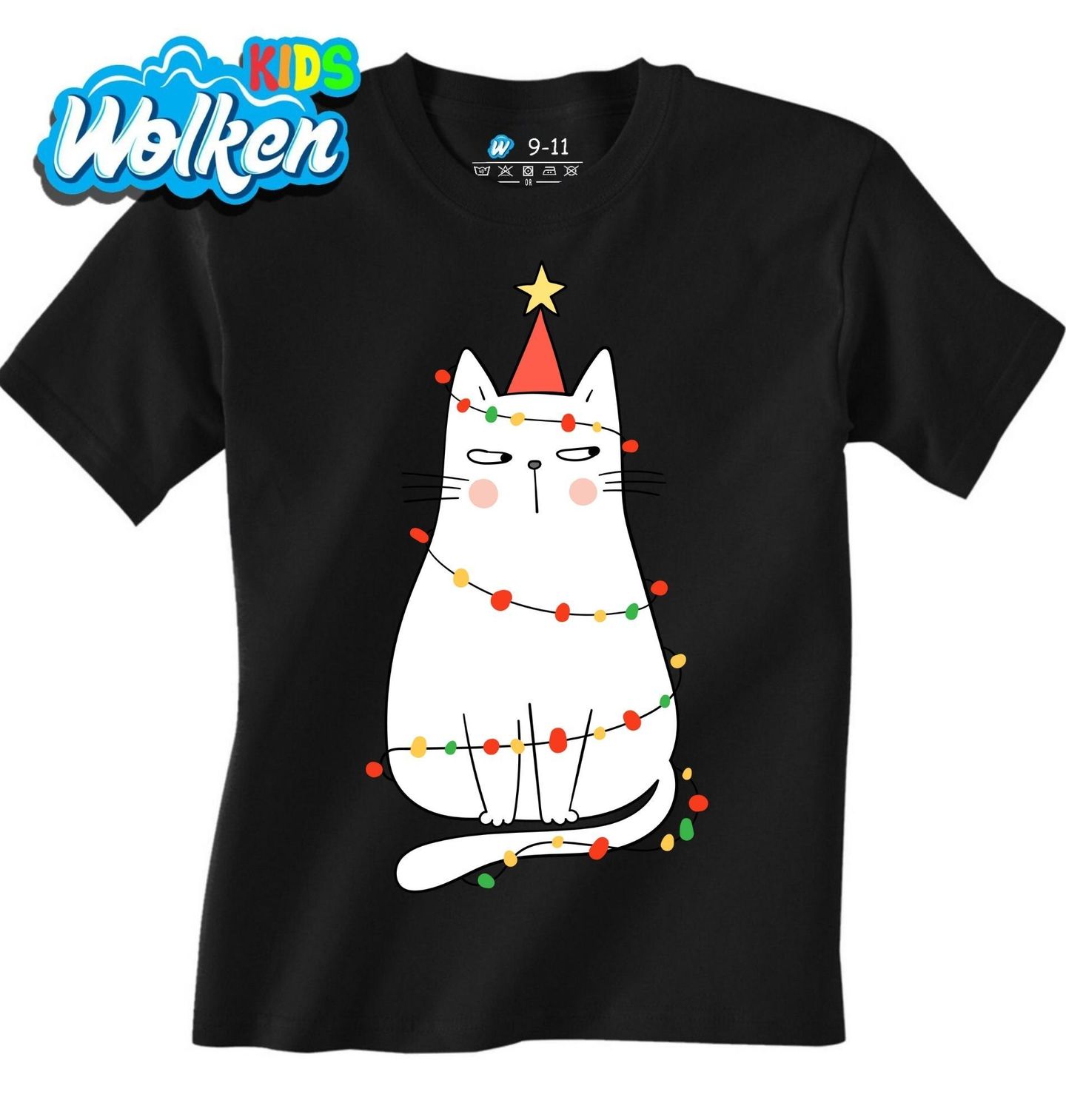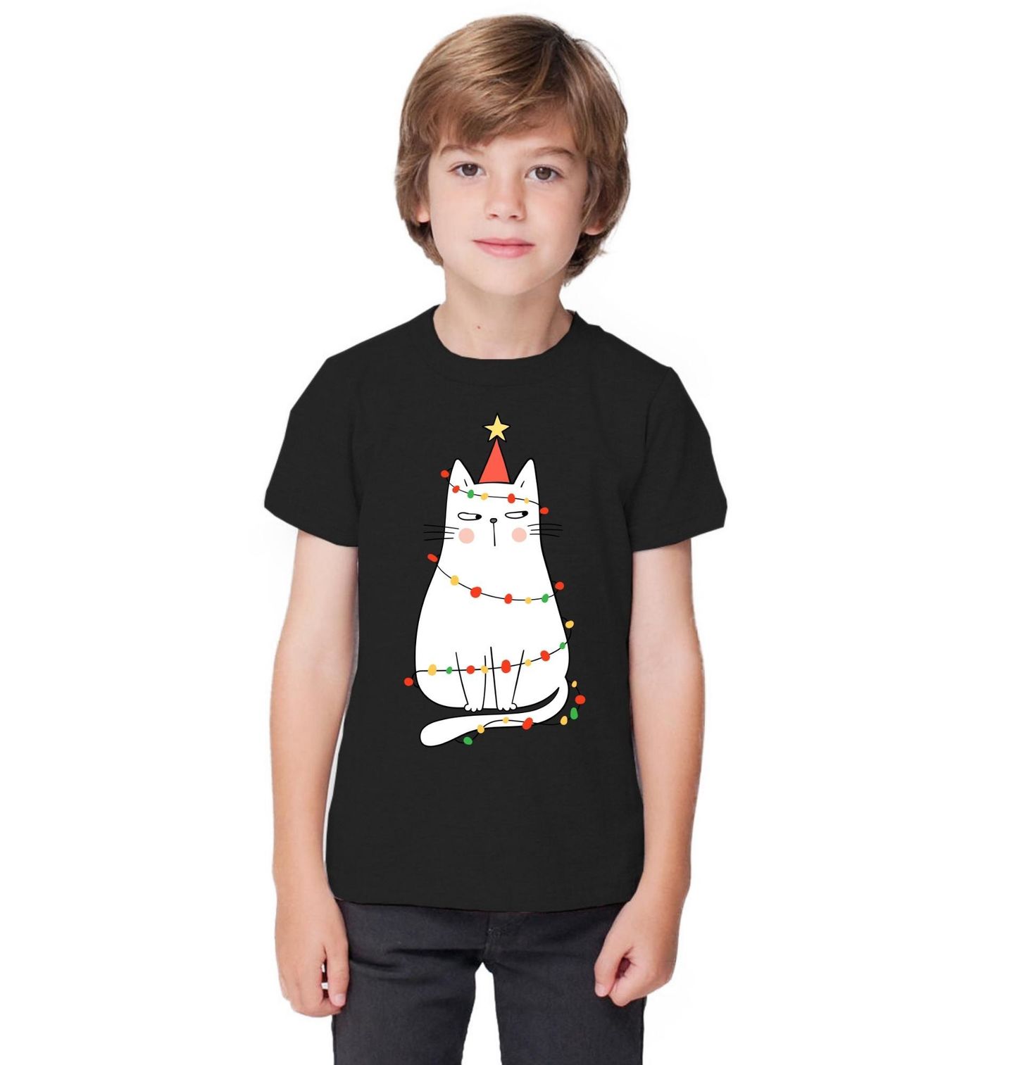 Dětské tričko Ozdobená Vánoční Kočka. Tahle kočka měla o svých Vánocích úplně jinou představu… Omotaná světýlky, s čepicí na hlavě a výrazem „nechte mě být“ – to je vánoční realita, kterou každý milovník koček pochopí. Pokud miluješ sarkasmus, Vánoce a kočky, tenhle motiv tě rozhodně pobaví.
