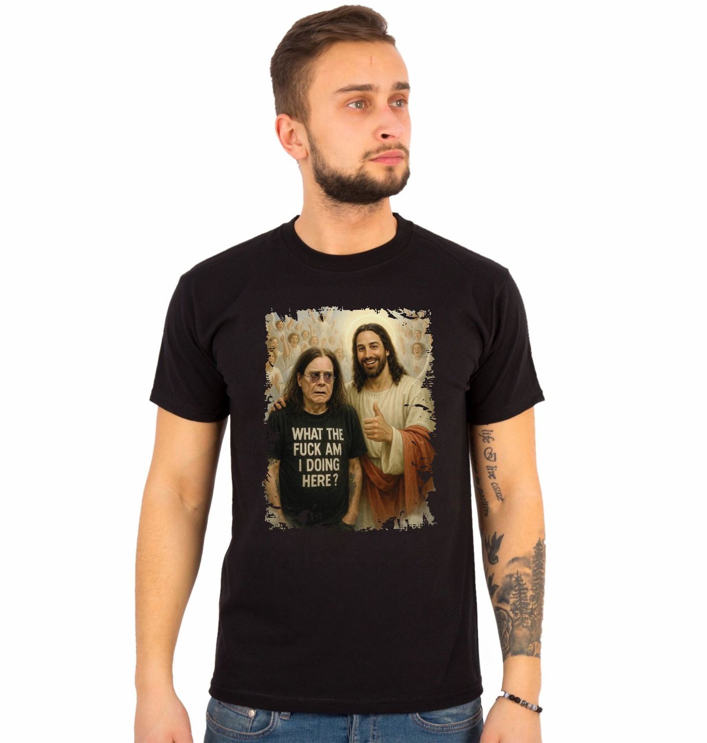 Pánské tričko Ozzy Osbourne v Nebi. What the fuck am i doing here? česky „Co tu kurva dělám?“. Humorný motiv zasazený do prostředí nebe, kde usměvavý Ježíš kontrastuje s překvapeným rockovým rebelantem Ozzy Osbournem a andělským davem v pozadí. Výrazný art potisk je ideální pro fanoušky netradičního humoru, rockové estetiky i originálních motivů, které vyčnívají z davu.