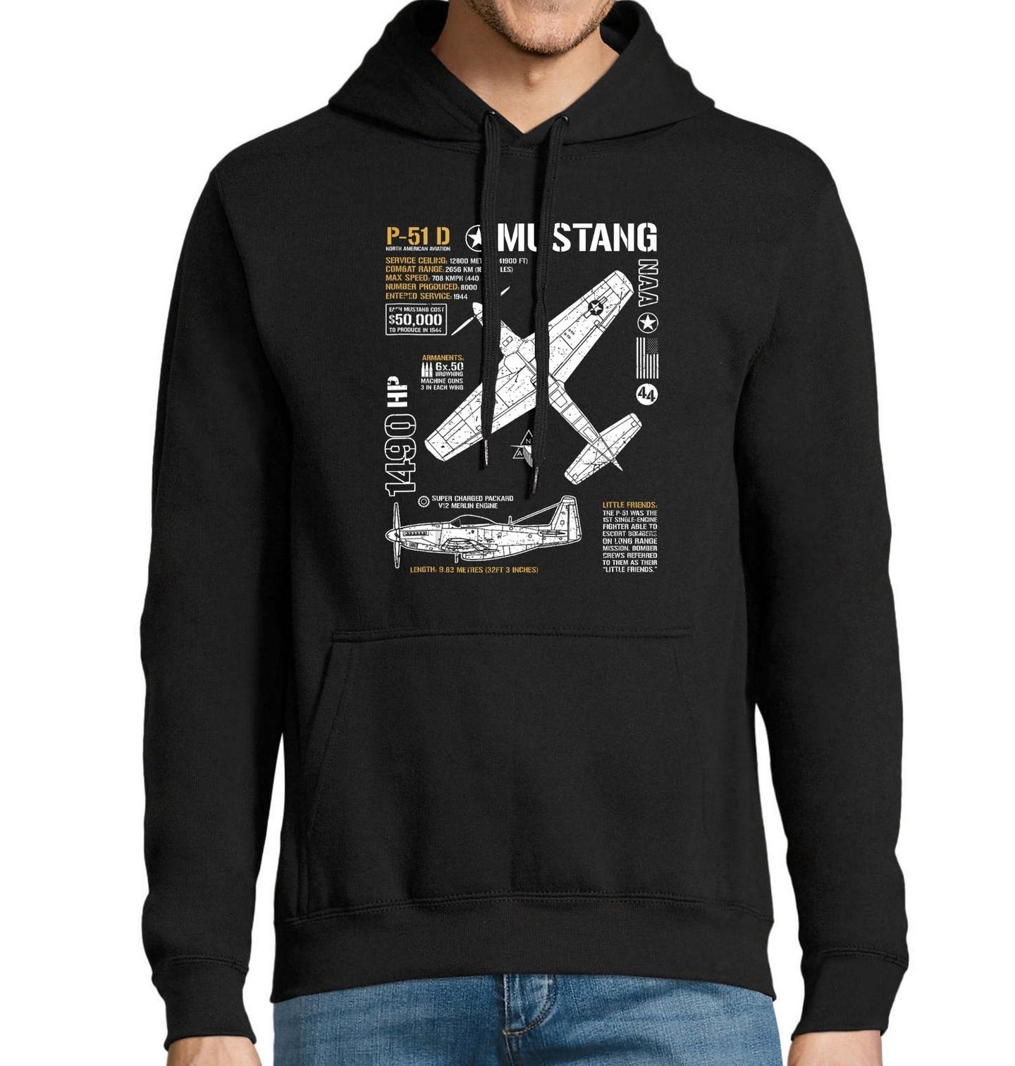 Pánská mikina P-51 Mustang Legenda nebes. P-51 se stal prvním stíhačem, který dokázal doprovázet bombardéry z Británie až nad Berlín a zpět. Díky tomu zásadně snížil ztráty bombardérů a změnil průběh vzdušné války v Evropě. Tričko pro fanoušky historie, letectví a pořádného stylu!