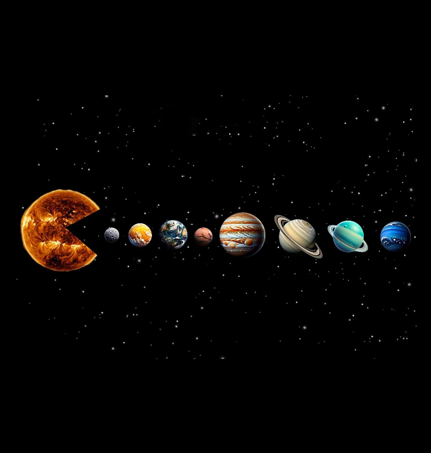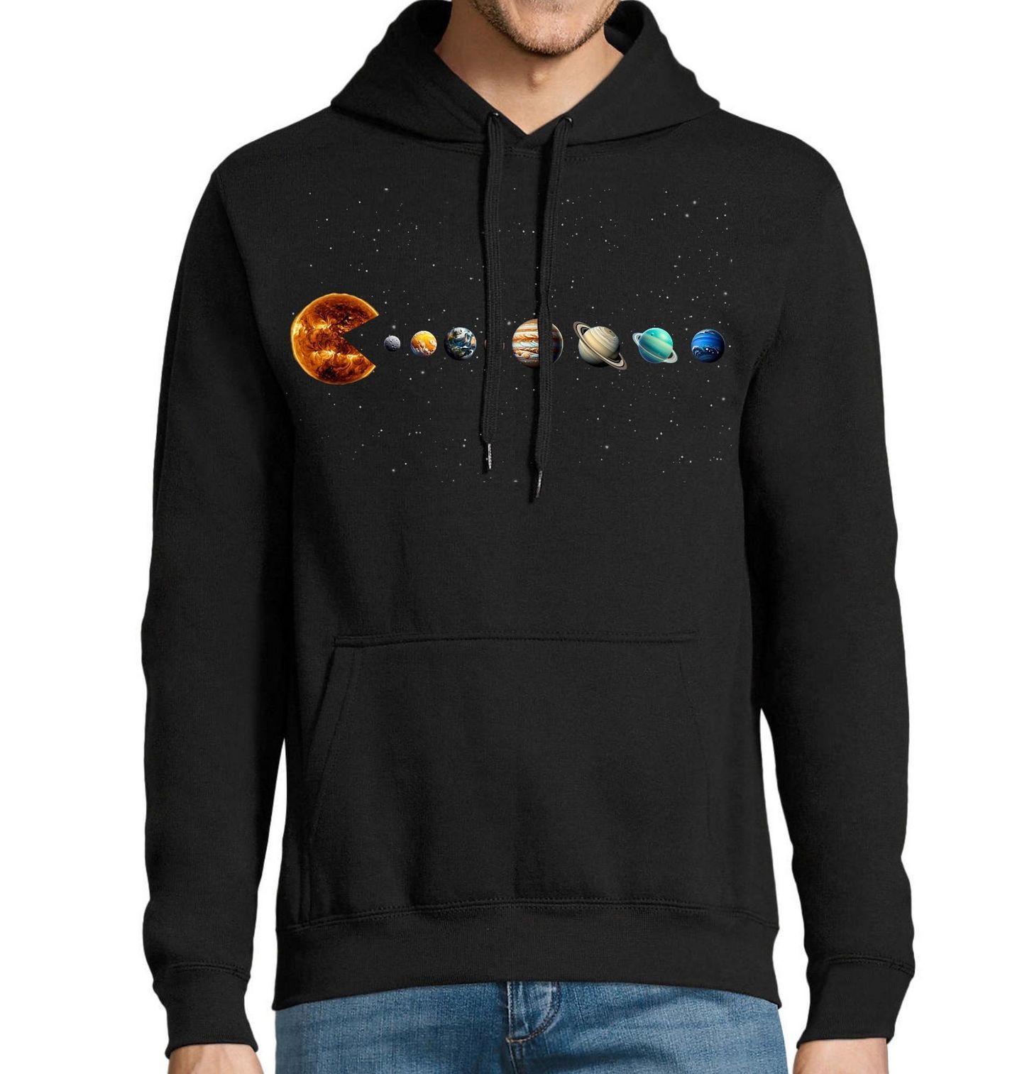 Pánská mikina Pac-Man a Planety Sluneční Soustavy. Grafika zobrazuje sluneční soustavu s planetami, které jsou požírány počítačovou postavou Pac-Mana. Perfektní dárek pro milovníky arkád a vesmíru.