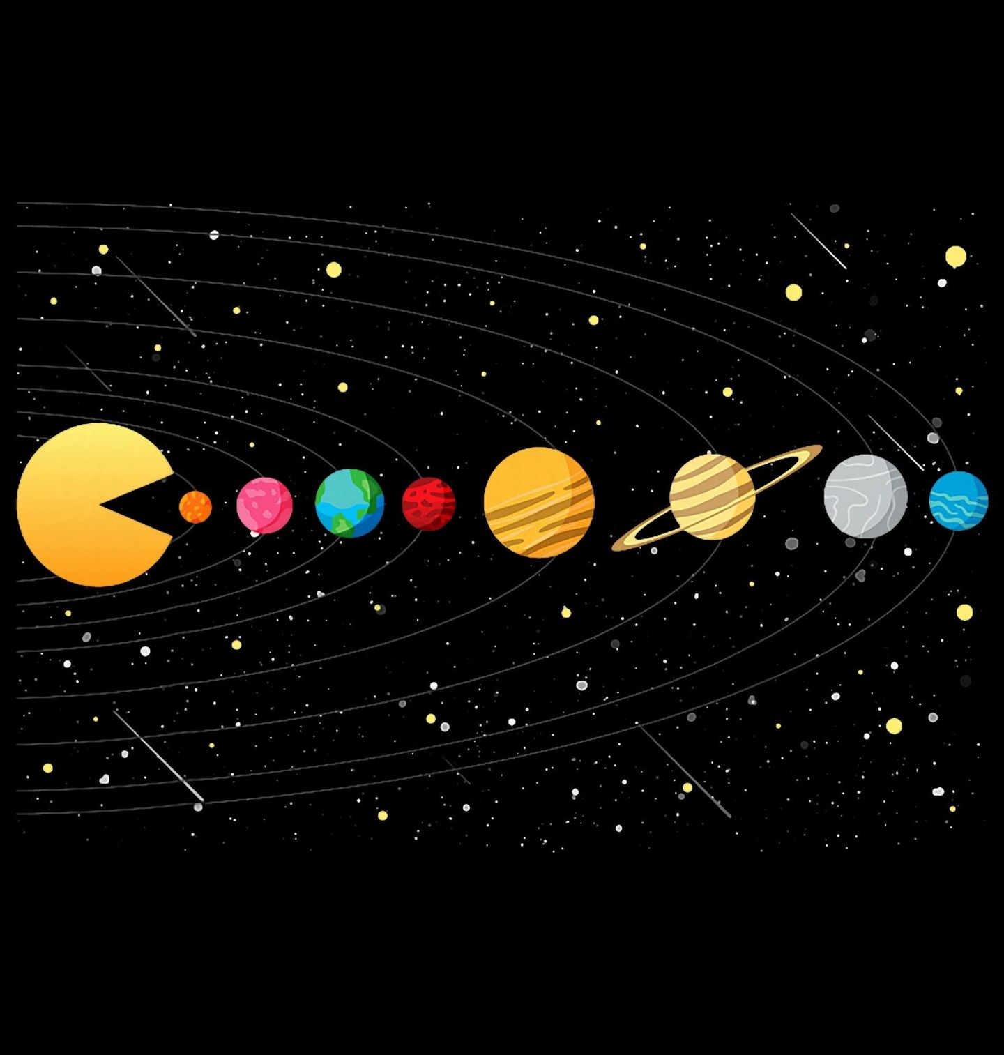 Pánské tričko Pac-Man Cartoon Sluneční Soustava. Roztomilý design s planetami jako Mars, Země, Venuše, Jupiter, Saturn, Uran, Neptun. Slunce jako počítačová postava Pac-Mana dodává motivu hravost. Ideální pro děti i fanoušky vesmíru a arkád.