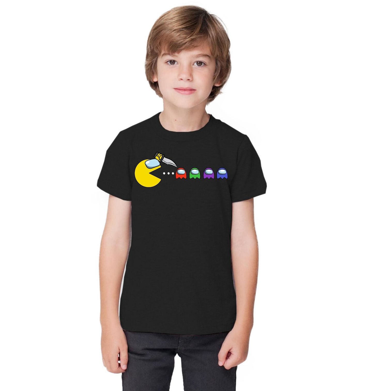 Dětské tričko Pac-man vs Among Us. Vtipná ilustrace inspirovaná herní kulturou kombinuje styl Pac-Mana a barevných postaviček z Among Us. Jednoduché provedení bez textu staví na okamžitém vizuálním humoru. Perfektní pro fanoušky her, meme kultury a moderní grafiky.