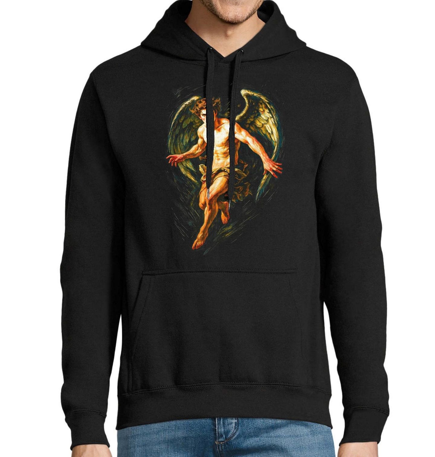 Pánská mikina Pád Íkara. Íkaros, syn slavného vynálezce Daidala, se pokusil uniknout z vězení pomocí křídel z peří a vosku. Okouzlen letem vystoupal příliš blízko ke slunci – vosk se rozpustil a on se zřítil do moře. Tento motiv zachycuje okamžik mezi vzestupem a pádem – napětí, svobodu i osudovost. Tento design čerpá z tématu řecká mytologie, která už tisíce let vypráví příběhy o lidské ctižádosti, síle i tragédii.