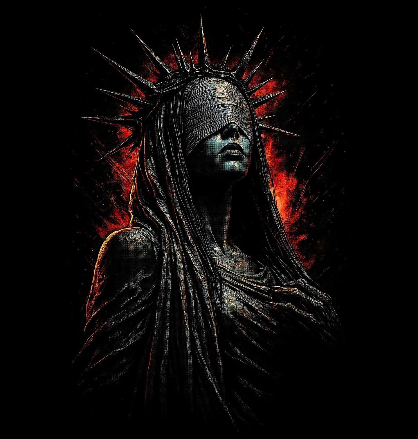 Dámské tričko Padlá Socha Svobody. Ikonický symbol v temném a tajemném pojetí – tento výrazný motiv představuje Socha svobody v netradiční, až dystopické podobě. Zahalená postava se zahalenýma očima a korunou ostnů působí silně, mysticky a zároveň znepokojivě. Design přetváří klasický symbol svobody do moderního uměleckého stylu, kde se prolíná krása, síla i temnota.