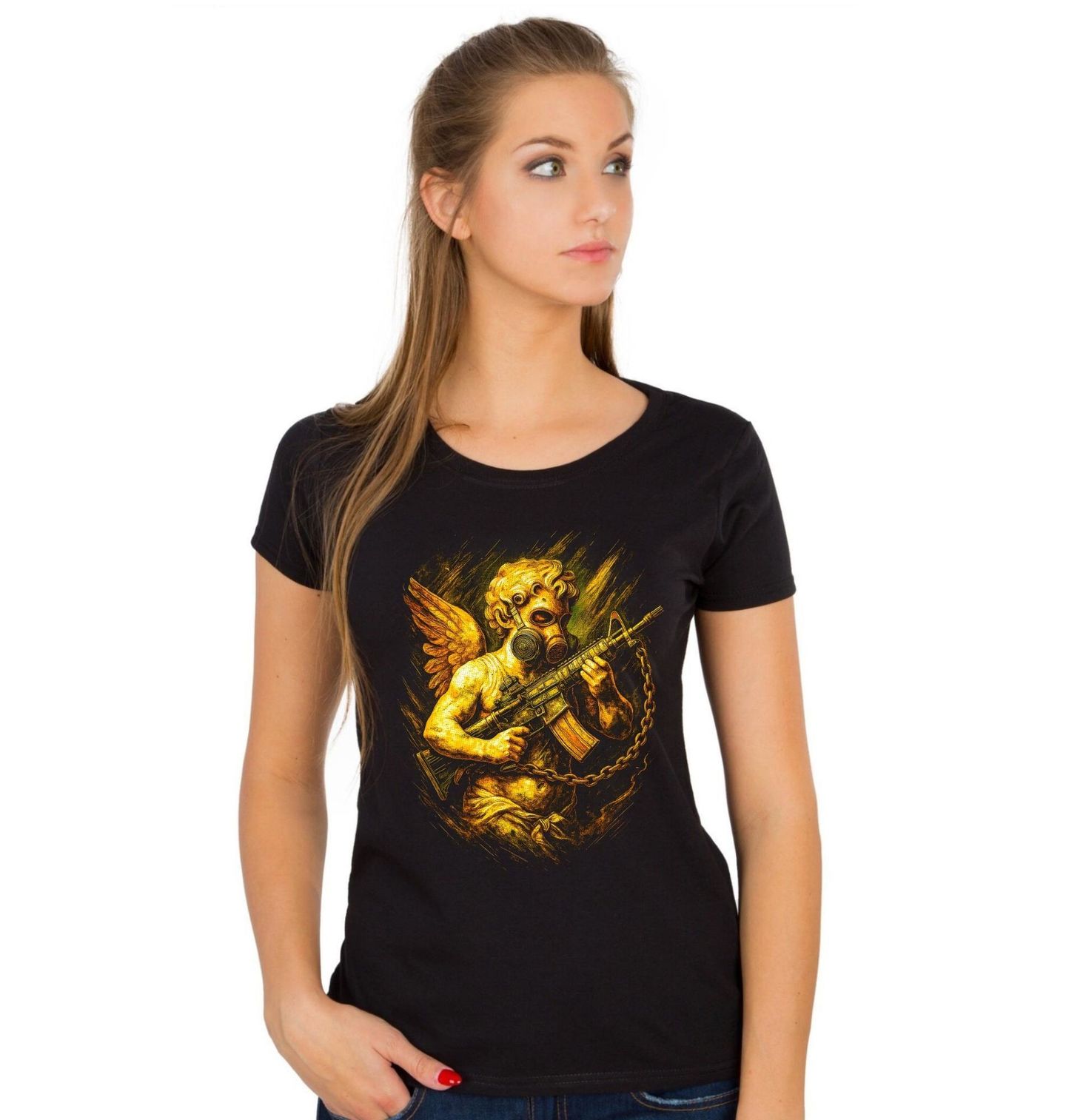 Dámské tričko Padlý Anděl s Puškou. Temnota se snoubí s nevinností v tomto výrazném motivu, kde anděl ztrácí svou čistotu a stává se bojovníkem. Na sobě má apokalyptickou masku, která odkazuje na postapokalyptickou realitu plnou nebezpečí a zkázy. V rukou drží moderní útočná puška typu M4 / AR-15, což podtrhuje kontrast mezi duchovnem a brutalitou reality. Řetěz, ostré detaily a zlatavé tóny dodávají designu syrovou energii a nekompromisní styl.