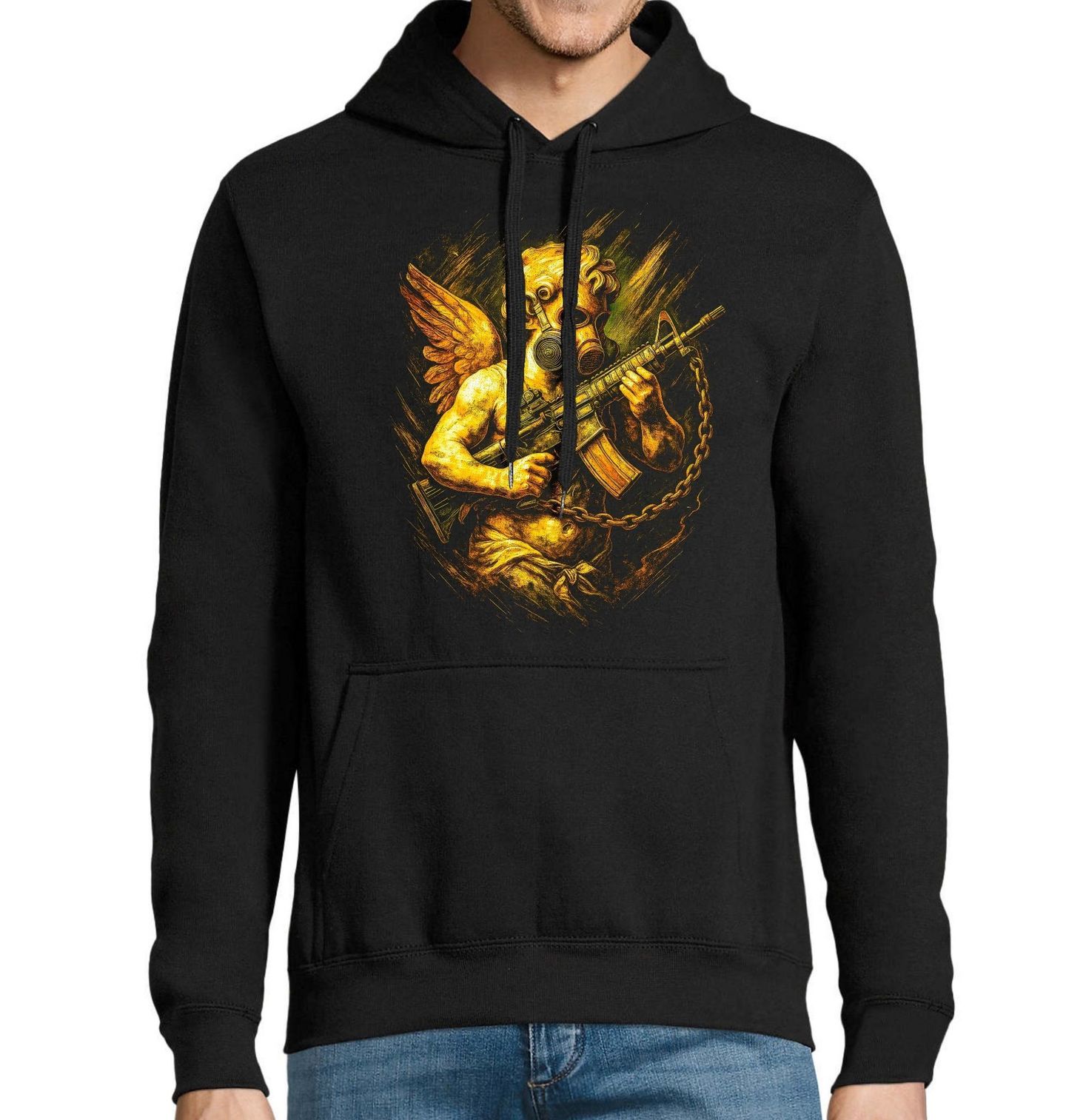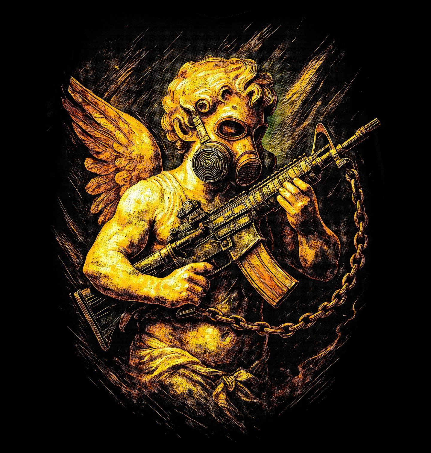 Pánská mikina Padlý Anděl s Puškou. Temnota se snoubí s nevinností v tomto výrazném motivu, kde anděl ztrácí svou čistotu a stává se bojovníkem. Na sobě má apokalyptickou masku, která odkazuje na postapokalyptickou realitu plnou nebezpečí a zkázy. V rukou drží moderní útočná puška typu M4 / AR-15, což podtrhuje kontrast mezi duchovnem a brutalitou reality. Řetěz, ostré detaily a zlatavé tóny dodávají designu syrovou energii a nekompromisní styl.