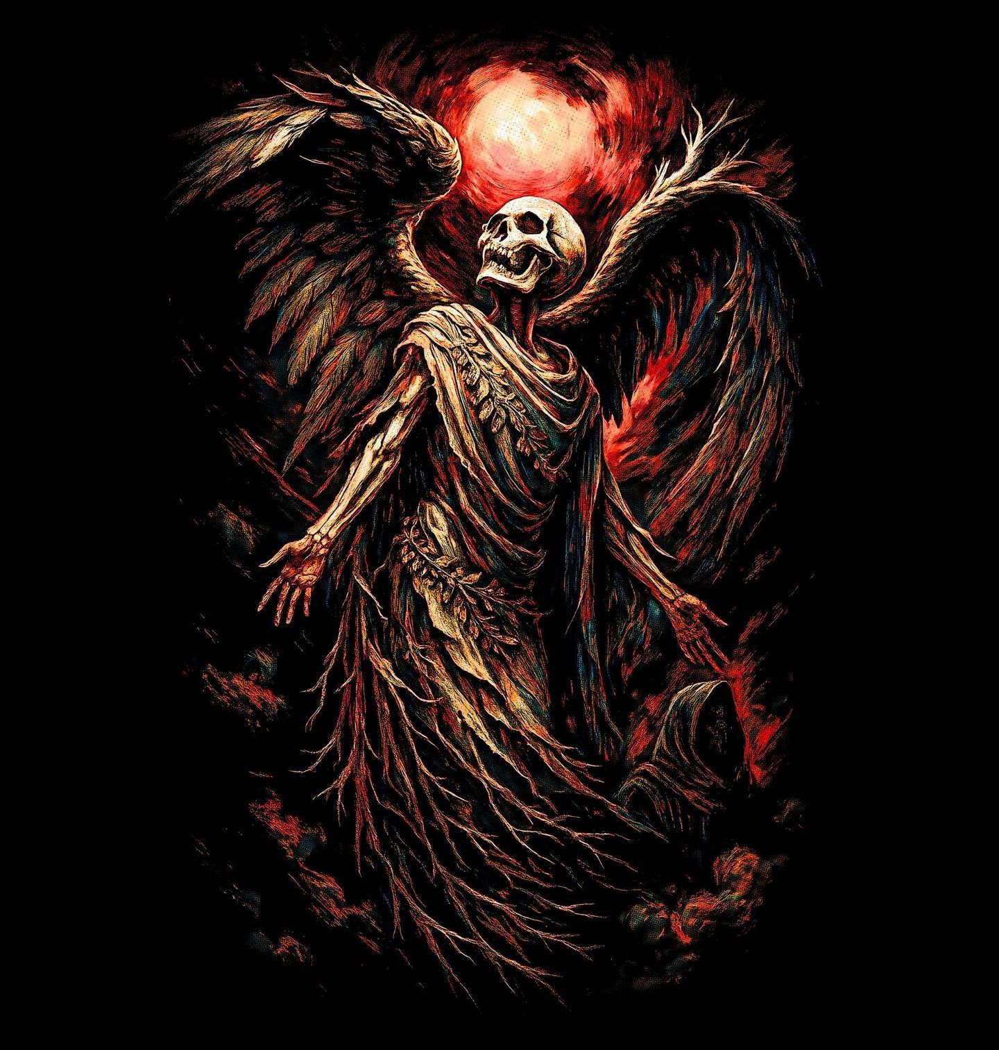 Pánská mikina Padlý Anděl Smrti. Působivý motiv, který zaujme na první pohled – kostlivec v podobě temného anděla se rozprostřenými křídly a dramatickou rudou září. Tento design kombinuje prvky mystiky, gotiky a fantasy stylu, díky čemuž je ideální pro všechny milovníky temného umění a výrazné estetiky. Detailně zpracovaný kostlivec evokuje sílu, svobodu i tajemství neznáma.