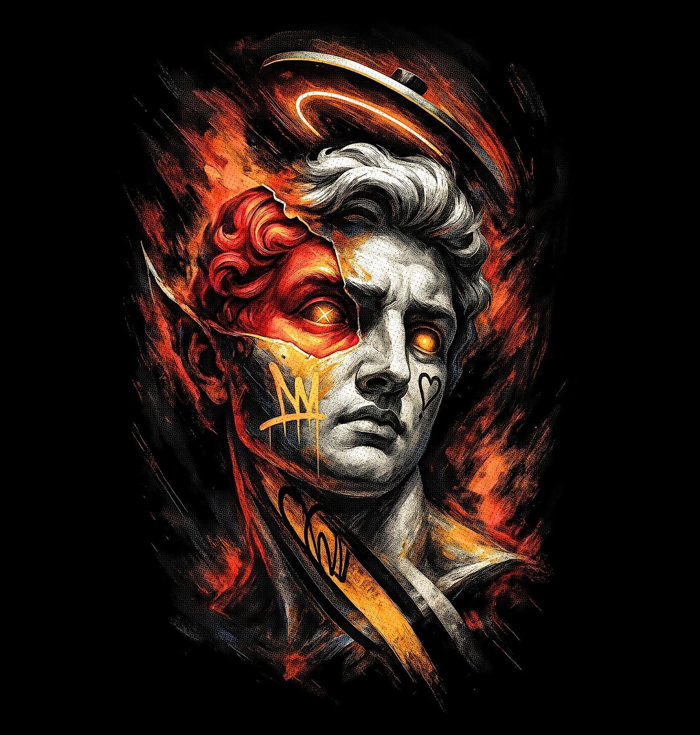 Pánské tričko Padlý David. David je biblický hrdina, symbol odvahy a vítězství nad silnějším protivníkem. Michelangelo Buonarroti jej zobrazil jako mladíka těsně před soubojem s Goliášem – v okamžiku soustředění, napětí a vnitřní síly. Socha se stala jedním z nejslavnějších děl světového umění a ikonou lidské dokonalosti. V této moderní verzi však není David nedotknutelný. Je „zničený“, poznamenaný. Graffiti a plameny symbolizují dnešní svět – tlak, chaos, rebelii i osobní proměnu.
