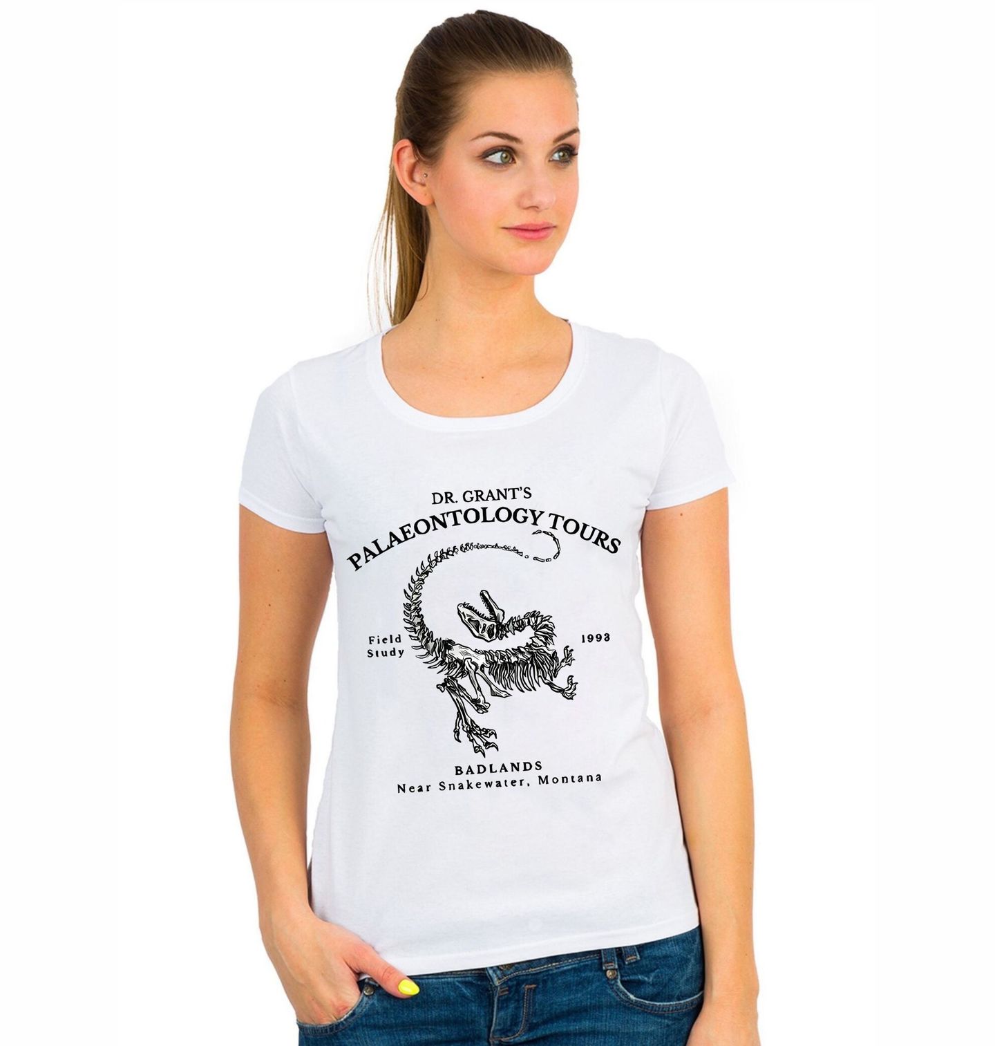 Dámské tričko Paleontologická Expedice. Vintage design s kostrou dinosaura a textem „DR. GRANT'S PALEONTOLOGY TOURS – Field Study 1993, Badlands Near Snakewater, Montana“ (Paleontologické výpravy Dr. Granta – terénní studie 1993, Badlands u Snakewater, Montana). Styl připomíná dobrodružství a objevování fosilií. Perfektní pro fanoušky dinosaurů, paleontologie a retro stylu.