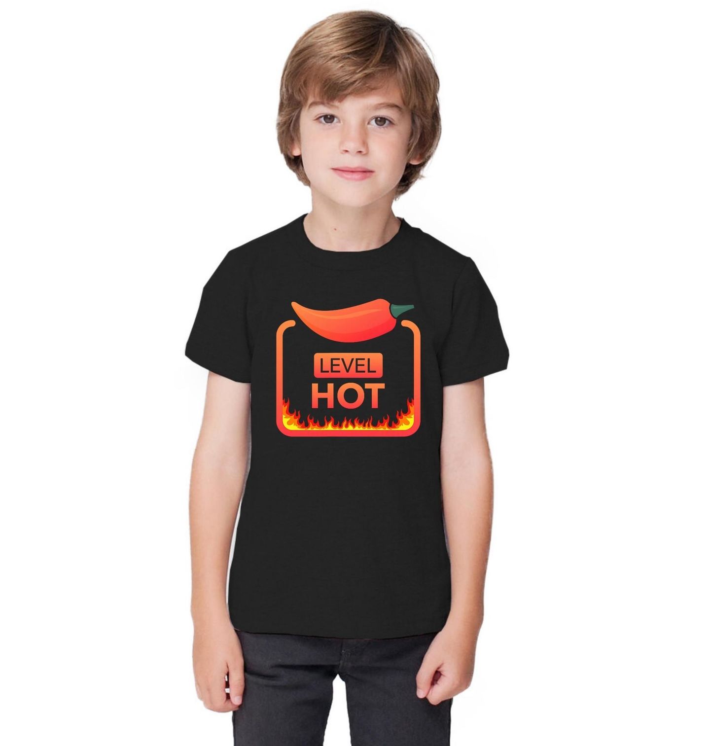 Dětské tričko Pálivý Level Level Hot. Stylový motiv zobrazuje chilli papričku jako symbol extrémní pálivosti a energie, doplněný ohnivým designem. Nápis „LEVEL HOT“ znamená „úroveň: pálivé“, což dokonale vystihuje intenzitu, kterou chilli přináší.