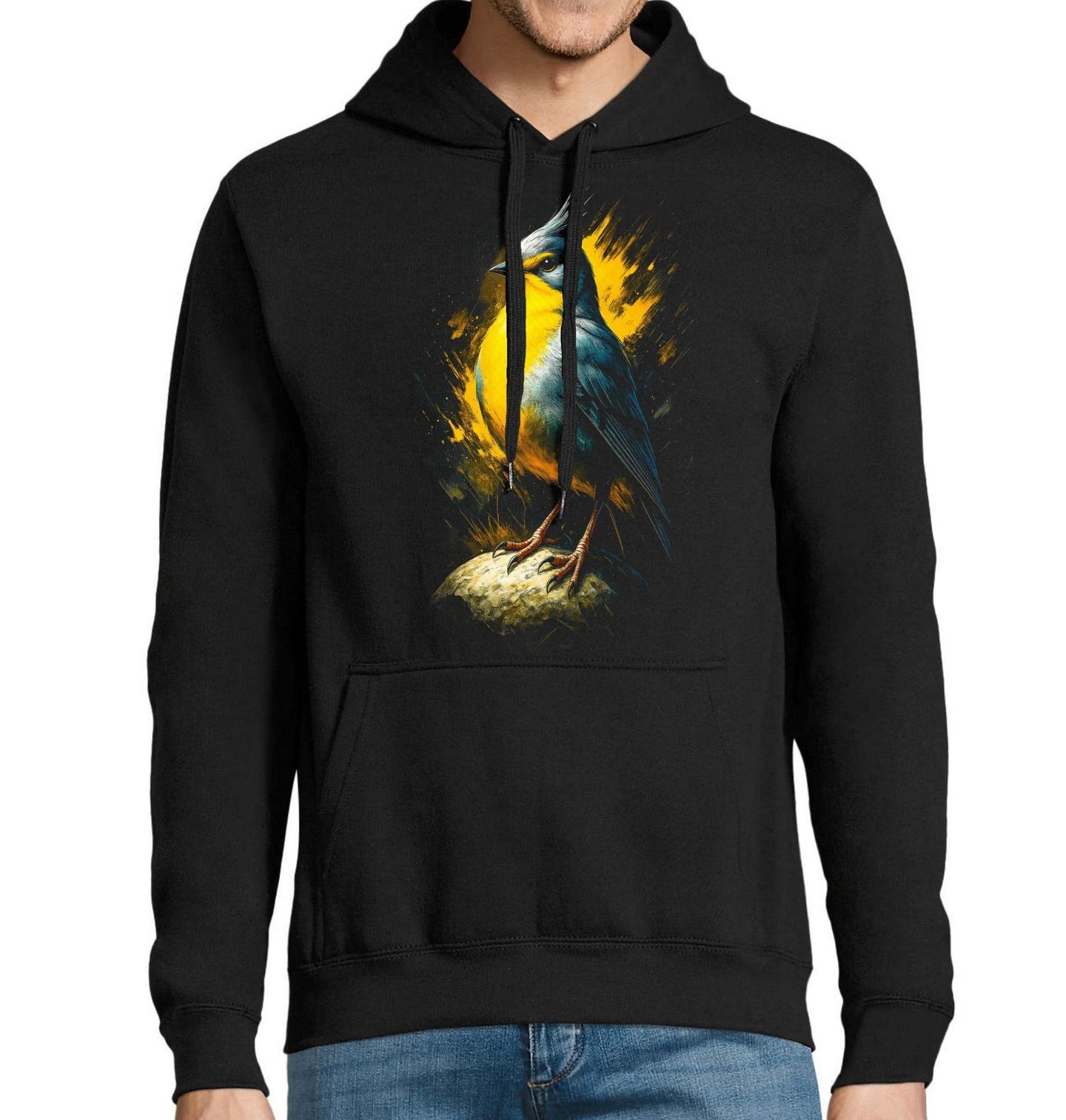 Pánská mikina Palmovník dlouhoocasý. Tento výrazný motiv zobrazuje ptáka známého jako palmovník dlouhoocasý, exotický druh obdivovaný pro svou eleganci, chocholku a vznešený vzhled. Ilustrace je pojata uměleckým způsobem, který zdůrazňuje ladnost siluety a symbolickou sílu tohoto výjimečného pěvce.