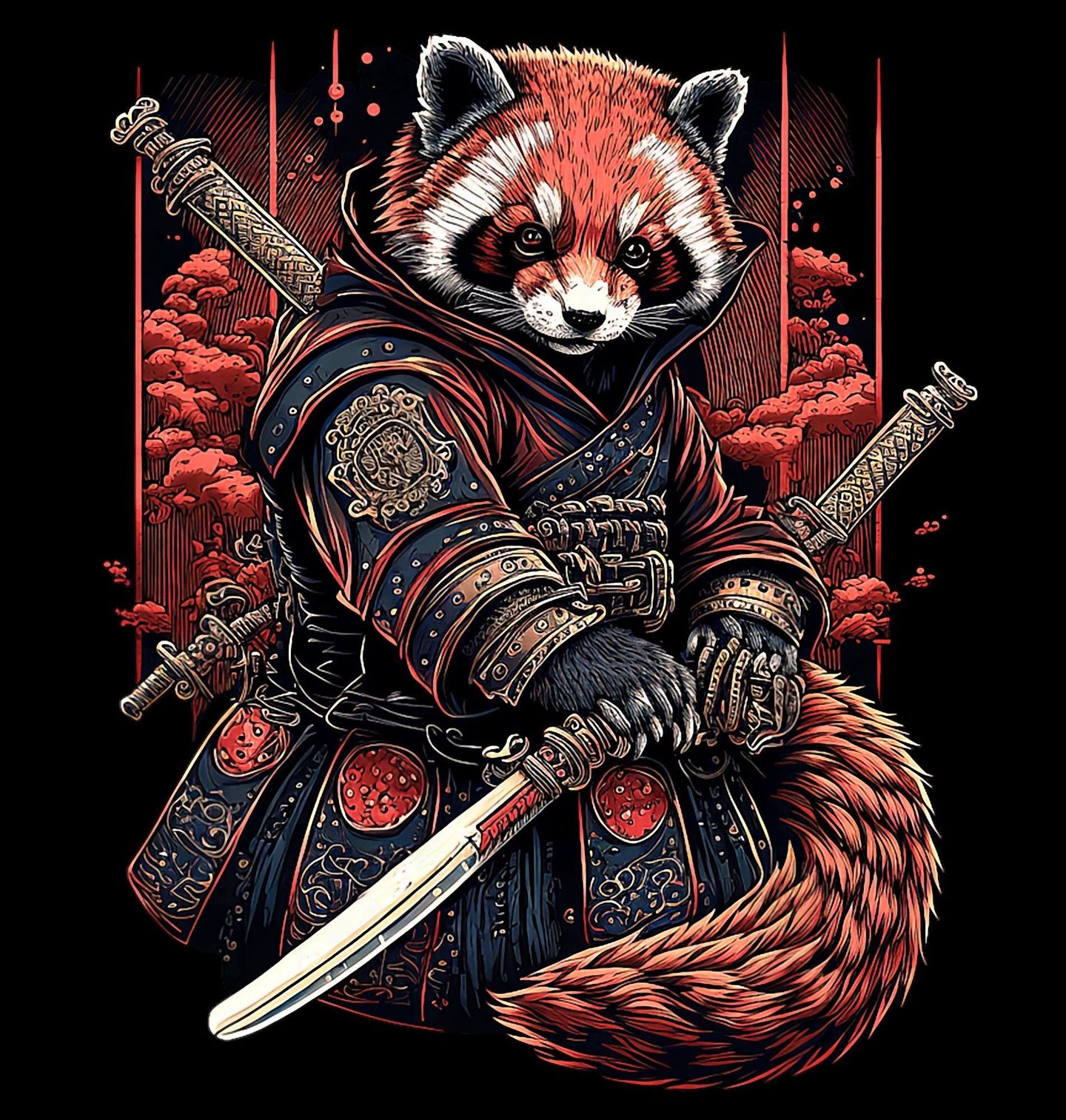 Pánské tričko Panda červená Samuraj s Katanou. Tato Panda červená je oděná v tradičním brnění připravená bránit svou čest i lesní království, za opaskem je legendární zbraň katana. Perfektní dárek pro každého, kdo má rád pandy, historii samurajů a Japonsko.