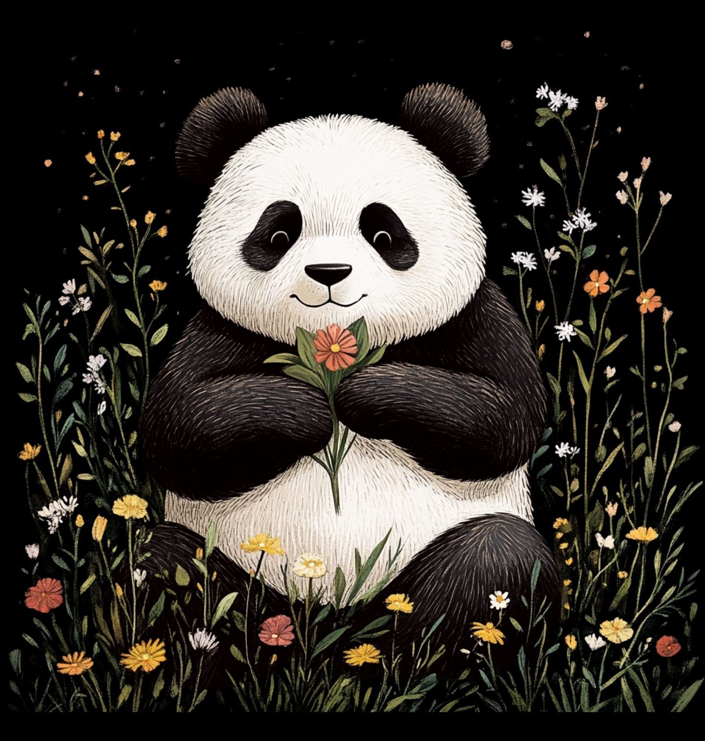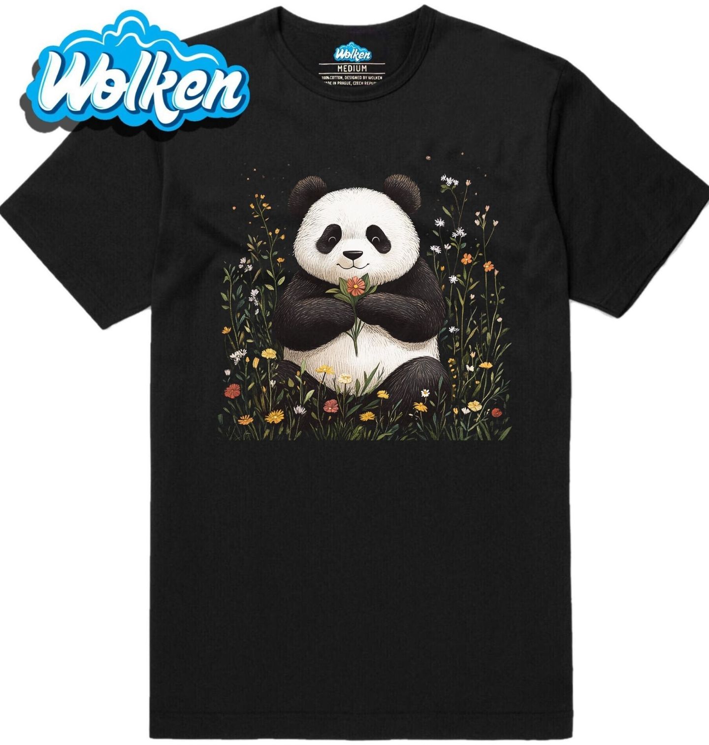 Pánské tričko Panda v Květinách. Roztomilý motiv s pandou obklopenou rozkvetlými květinami je ideální volbou pro milovníky přírody, zvířat i hravého stylu. Panda držící květinu v tlapkách působí uklidňujícím a radostným dojmem, zatímco květiny kolem přináší barevnou harmonii a něhu.