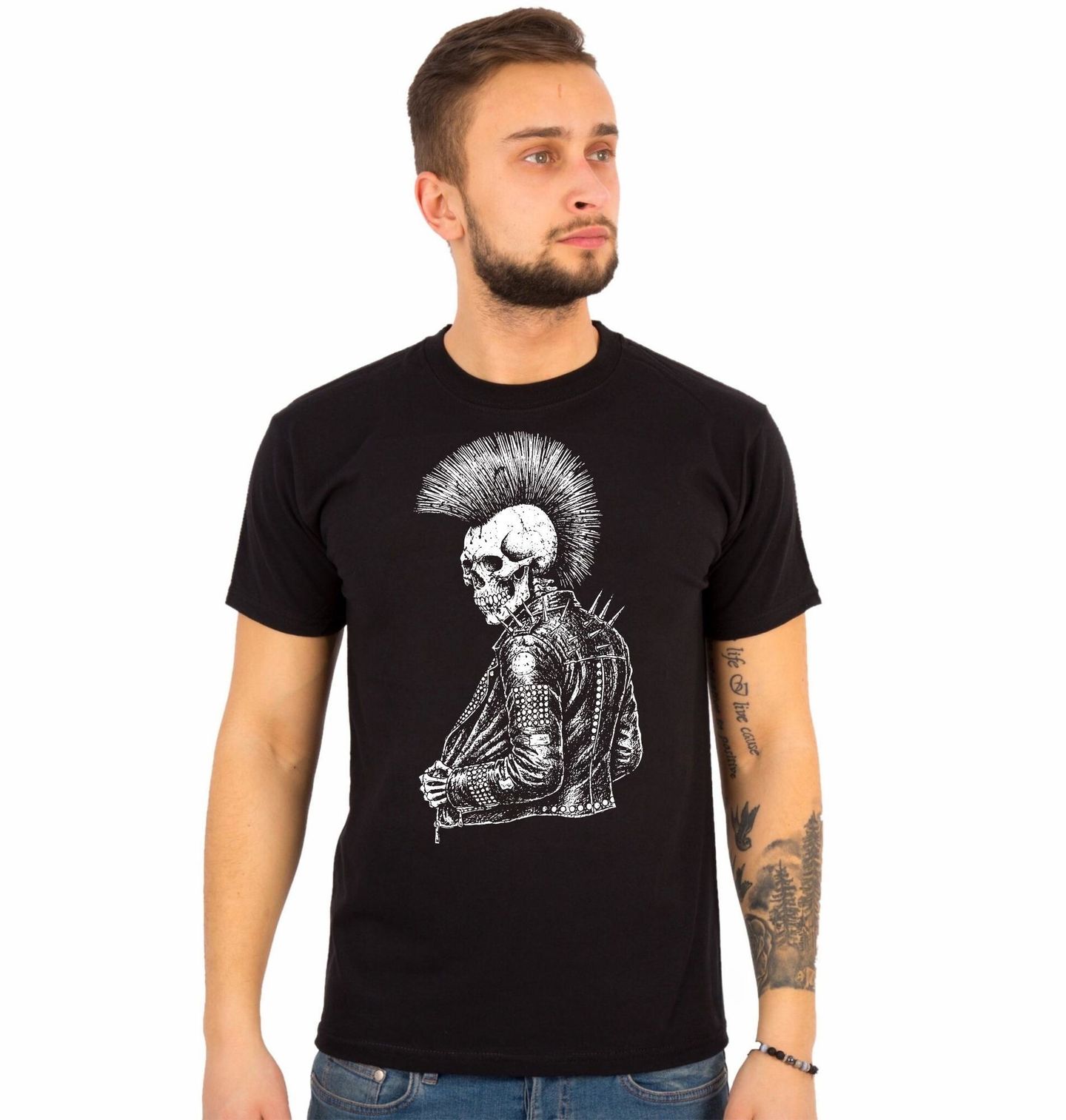 Pánské tričko Pankáč Kostlivec. Drsný a stylově výrazný motiv, kde dominuje kostlivec v podobě pravého pankáč s ikonickým čírem a koženou bundou plnou hrotů. Tento design zosobňuje svobodu, vzdor a nezkrotnou energii punkové kultury. Detailní ilustrace kostlivce v rebel stylu zaujme na první pohled a dodá každému outfitu ostrý charakter.