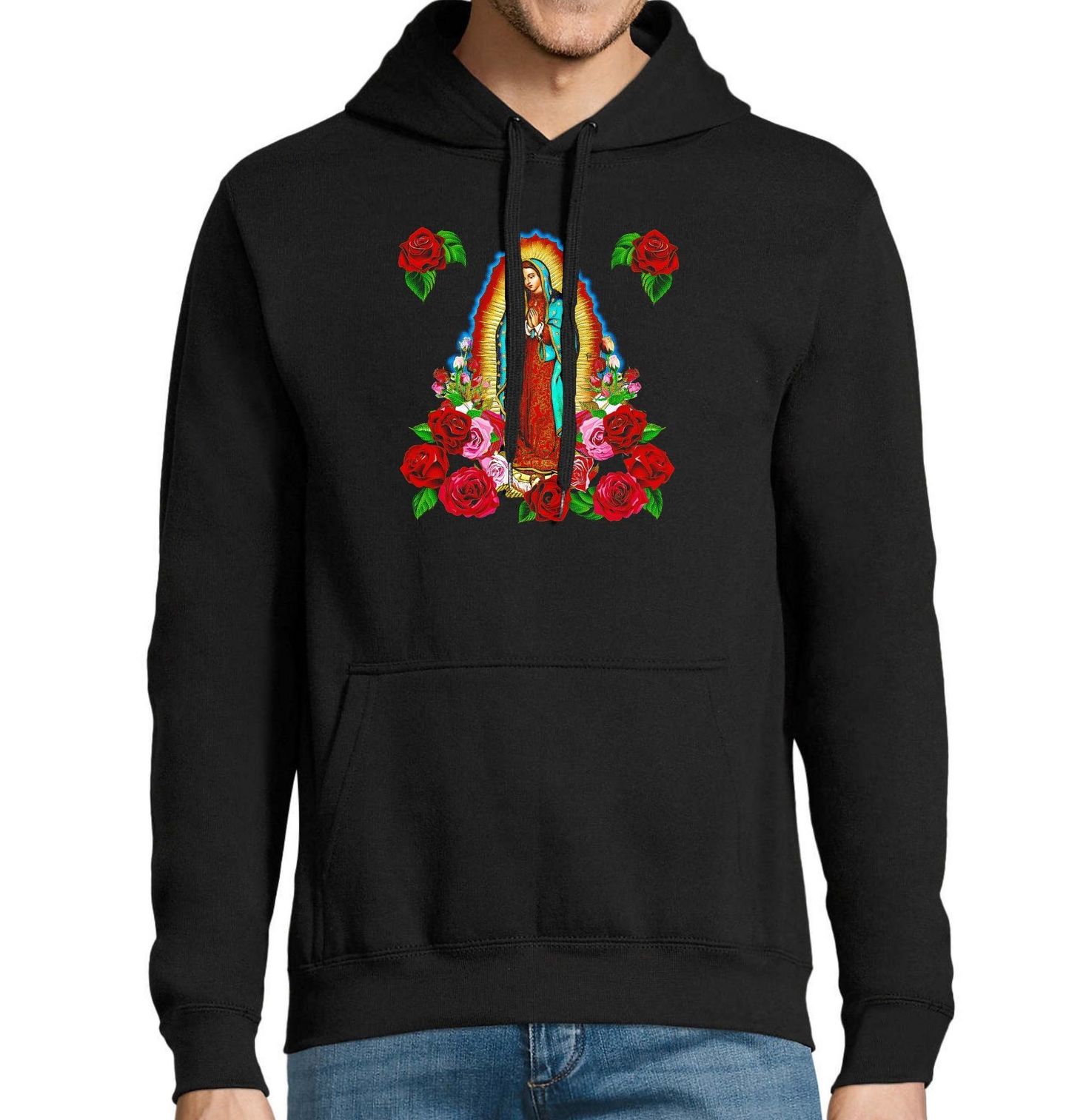 Pánská mikina Panna Marie a Růže. Panna Marie obklopená růžemi a zářící svatozáří působí jako tichý ochránce a symbol víry i naděje. Výrazné barvy, bohaté detaily a duchovní síla obrazu z něj dělají nejen umělecké dílo, ale i silné vyjádření osobní identity. Ideální volba pro každého, kdo hledá spojení spirituality, estetiky a hlubšího významu v jediném motivu.