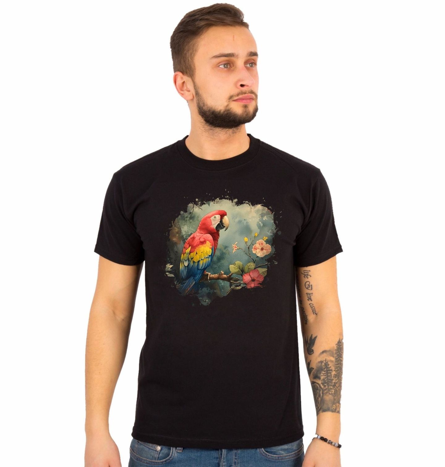 Pánské tričko Papoušek Ara červený na Větvi. Tento elegantní motiv zachycuje majestátního papoušek druhu ara červený (Ara macao), jednoho z nejznámějších a nejbarevnějších papoušků světa. Ara červený žije především v tropických deštných pralesech Střední a Jižní Ameriky, kde obývá husté lesy, koruny stromů a oblasti bohaté na květy a plody.