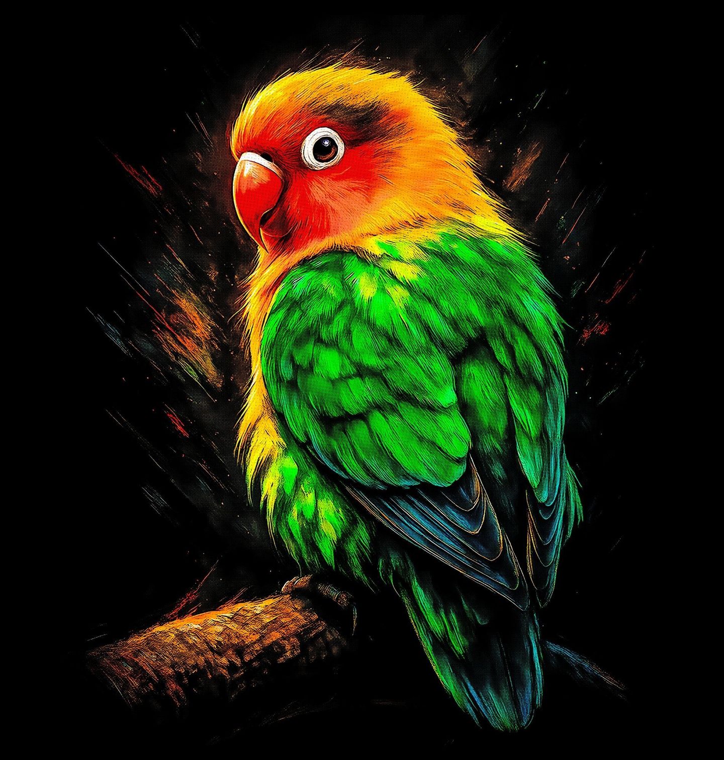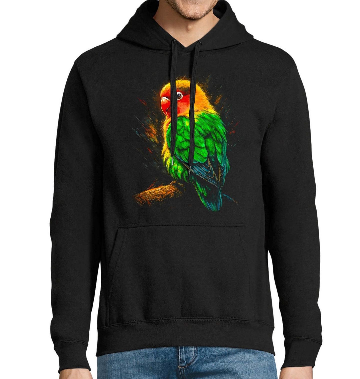 Pánská mikina Papoušek lásky Agapornis Lovebirds. Na motivu je papoušek – agapornis (česky papoušík / hrdlička lásky). Tento exotický pták je oblíbený pro své zářivé barvy, hravou povahu a silné pouto ke svému partnerovi. Motiv je ideální pro milovníky ptactva, exotických zvířat a výrazných designů.