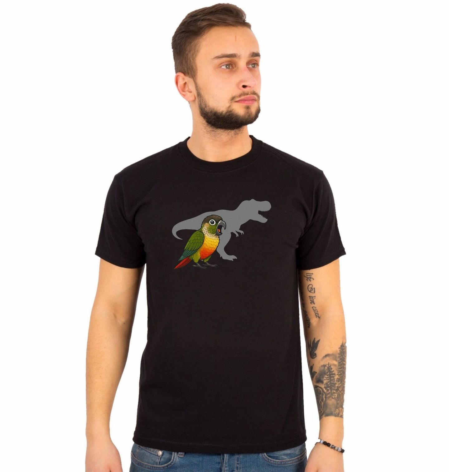 Pánské tričko Papoušek s Duší Dinosaura. Originální a vtipný motiv, na kterém je barevný papoušek a za ním silueta obřího predátora – dinosaurus T-Rex. Ideální pro všechny milovníky zvířat, pravěku i humoru. Připomíná, že papoušek je vlastně malý moderní dinosaurus – jen mnohem roztomilejší!