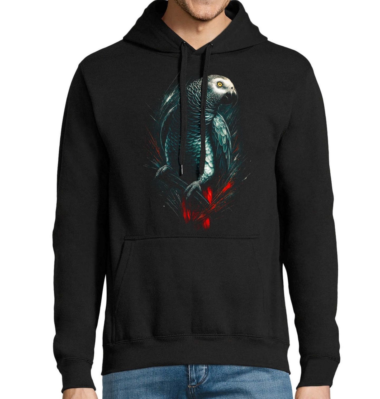 Pánská mikina Papoušek šedý Žako. Papoušek žako šedý, výjimečný exotický pták známý svou inteligencí, vnímavostí a klidným vystupováním. Žako šedý patří mezi nejchytřejší papoušky na světě. Tento papoušek dokáže napodobovat lidskou řeč, chápat význam slov a vytvářet silné sociální vazby.