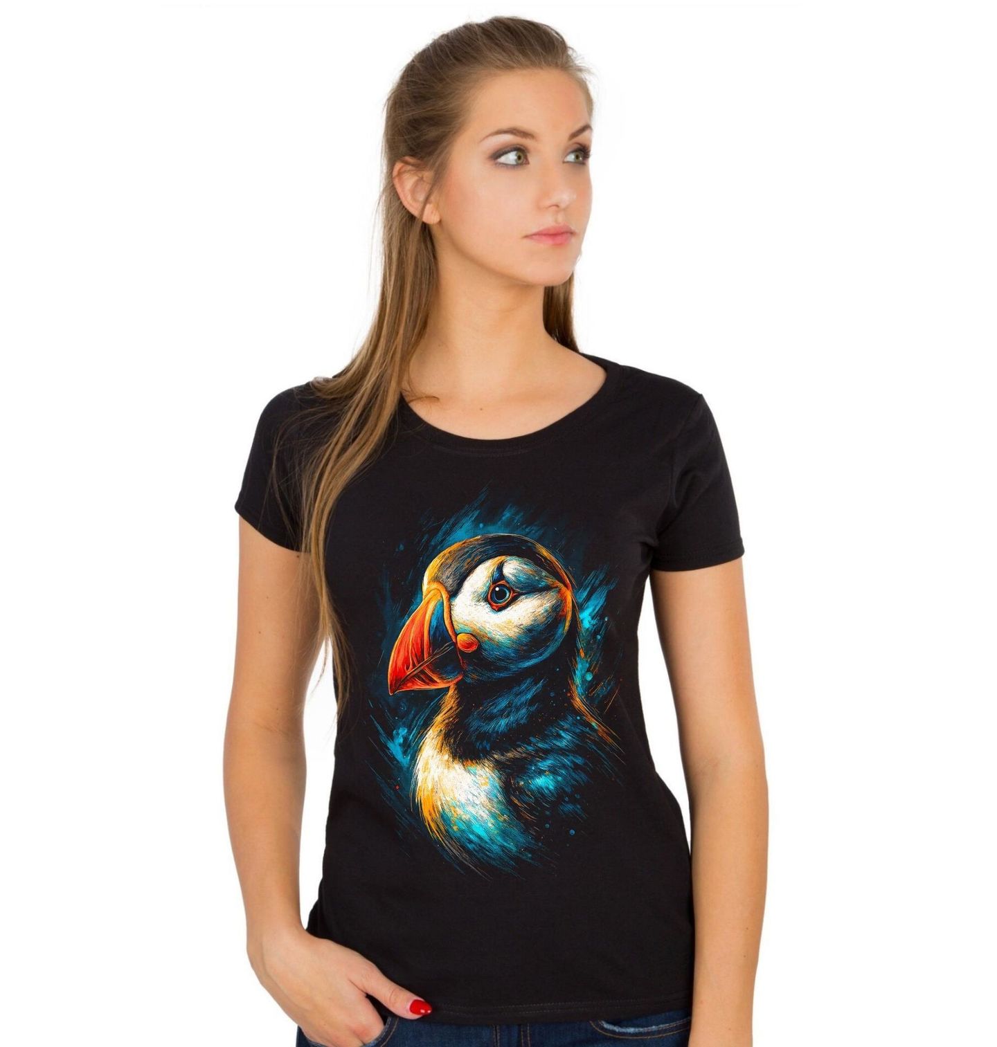 Dámské tričko Papuchalk severní. Atlantic puffin, známý též pod názvy papuchalk ploskozobý nebo bělobradý, je malý mořský pták z čeledi alkovitých. Díky výrazně zbarvenému velkému zobáku má přezdívku „mořský papoušek“ a protože se navíc při chůzi kolébá, také „mořský klaun“. Tento mořský pták symbolizuje divokou přírodu severních oceánů a díky modernímu uměleckému zpracování působí dynamicky a stylově.