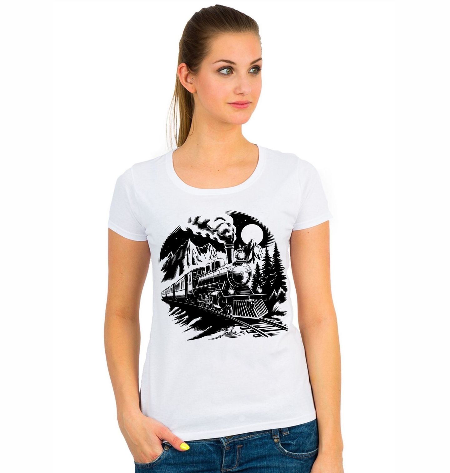 Dámské tričko Parní Lokomotiva v Horách. Stylový černobílý motiv zachycující klasický vlak a parní lokomotivu projíždějící dramatickou horskou krajinou pod noční oblohou. Detailní ilustrace dodává celému designu retro atmosféru a evokuje dobu, kdy byla železnice symbolem dobrodružství a svobody.