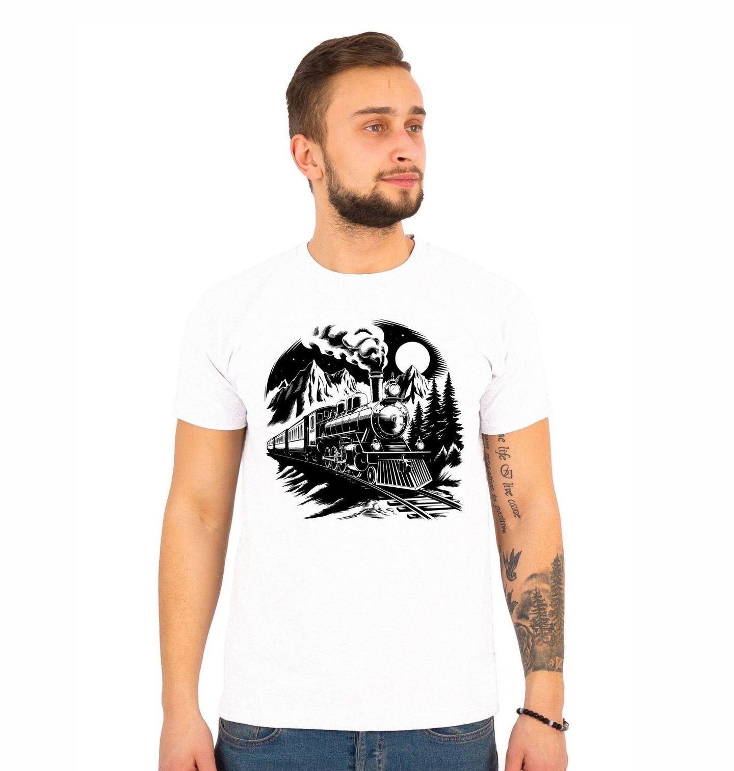 Pánské tričko Parní Lokomotiva v Horách. Stylový černobílý motiv zachycující klasický vlak a parní lokomotivu projíždějící dramatickou horskou krajinou pod noční oblohou. Detailní ilustrace dodává celému designu retro atmosféru a evokuje dobu, kdy byla železnice symbolem dobrodružství a svobody.