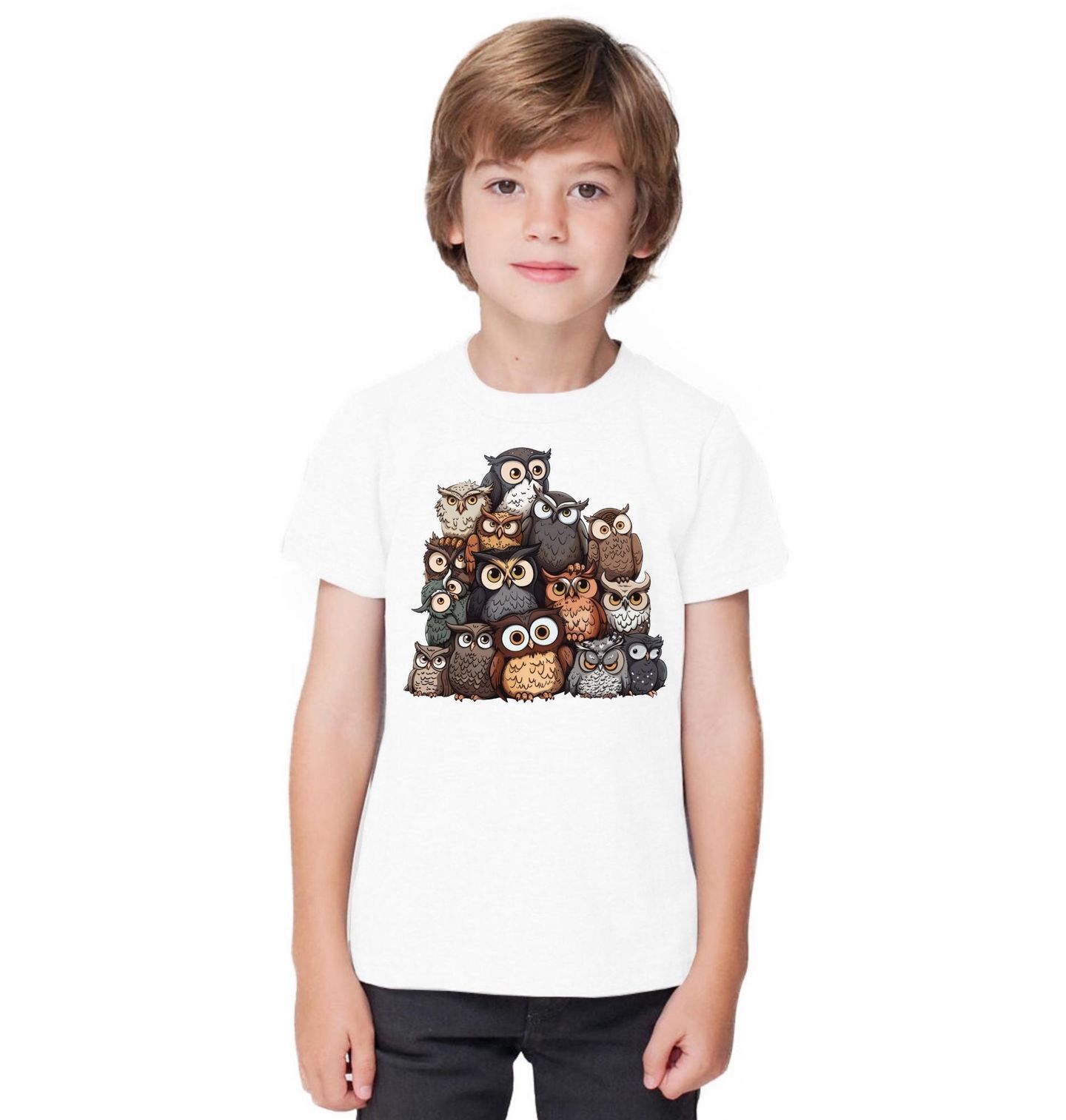 Dětské tričko Parta Moudrých Sov. Originální motiv zachycuje roztomilou skupinu ptáků, kde hlavní roli hrají sovy v různých podobách a barvách. Každá sova má jedinečný výraz a charakter, což dává designu hravý i stylový nádech. Ilustrace působí mile, ale zároveň elegantně, a proto se hodí pro každodenní nošení i jako dárek. Detailně zpracované sovy symbolizují moudrost, klid a tajemství noční přírody.