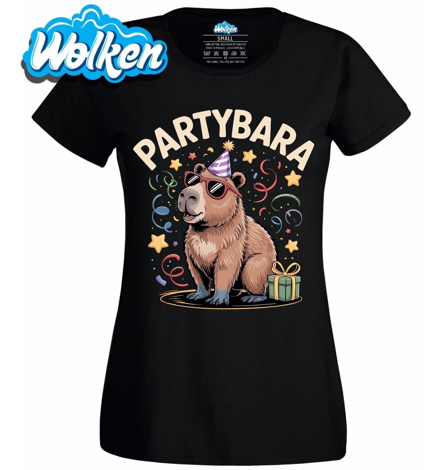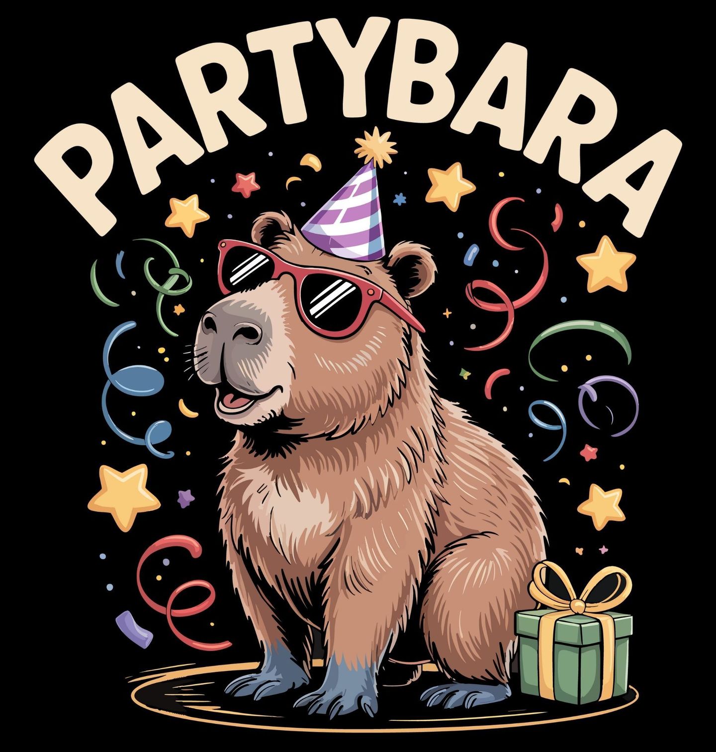 Dámské tričko Párty Kapybara Partybara. Tahle stylová kapybara v párty čepici a slunečních brýlích ti připomene, že každá oslava je lepší s trochou zvířecí pohody. Ať už slavíš narozeniny nebo jen pátek, hlodavec je vždycky ready na párty! Ideální motiv pro všechny milovníky zábavy, relaxu a netradičního humoru.