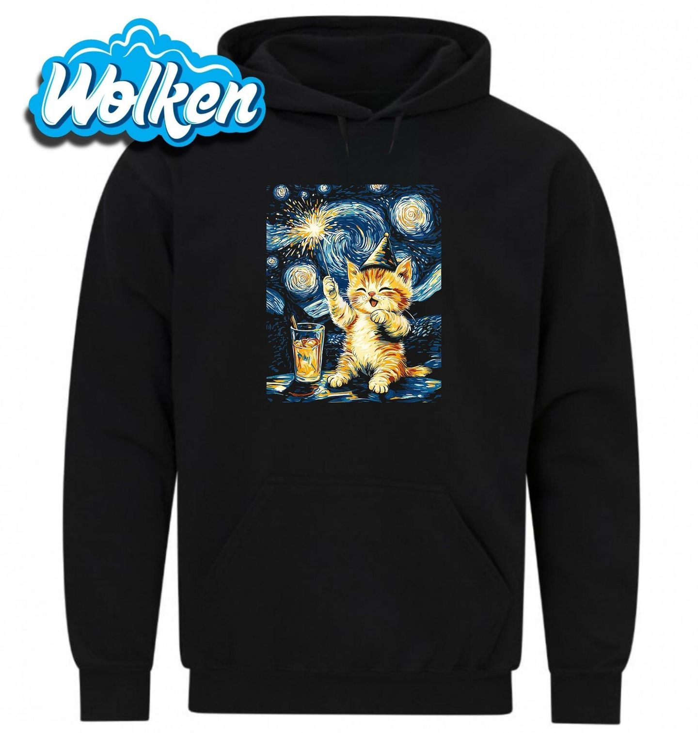 Pánská mikina Party Kočka ve Hvězdné noci. Užijte si párty stylově s parodií na slavný obraz Hvězdná noc od Vincenta van Gogha. Místo malíře tu však slaví malá veselá kočka s prskavkou v ruce a drinkem po boku. Perfektní dárek pro všechny milovníky koček, umění i silvestrovských večírků.