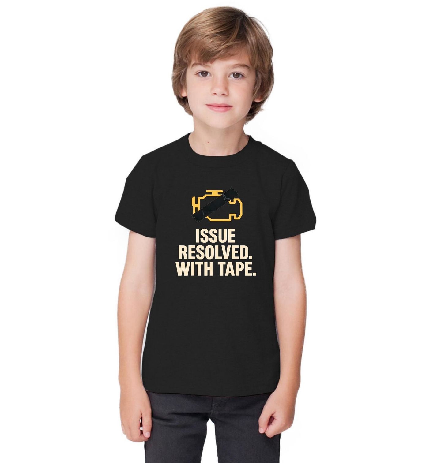 Dětské tričko Páska Vyřeší Všechny Problémy. Vtipný motiv ukazuje, že každá situace má řešení – stačí páska a žádný problém není překážkou. Nápis „ISSUE RESOLVED. WITH TAPE.“ znamená „Problém vyřešen. Pomocí pásky.“, což vystihuje jednoduchý a kreativní přístup k opravám i každodenním výzvám.