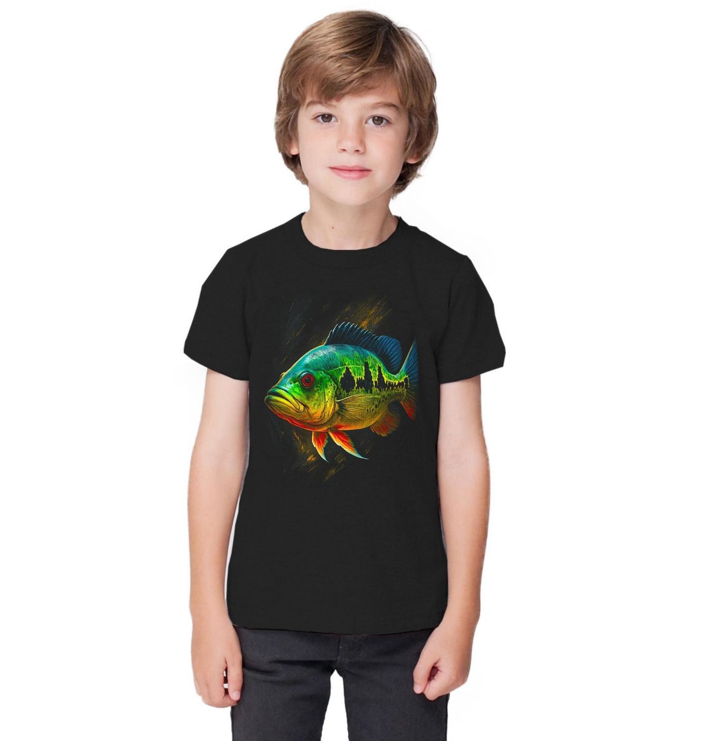 Dětské tričko Paví okoun Peacock bass. Výrazný a barevně explozivní motiv zachycuje pavího okouna (Cichla ocellaris), jednoho z nejagresivnějších a nejvyhledávanějších sladkovodních dravců světa. Typické zeleno-žluté zbarvení s tmavými skvrnami a červenými ploutvemi okamžitě upoutá pozornost každého rybáře. Tento obraz dokonale vystihuje dynamiku, napětí a adrenalin, které k rybaření neodmyslitelně patří.