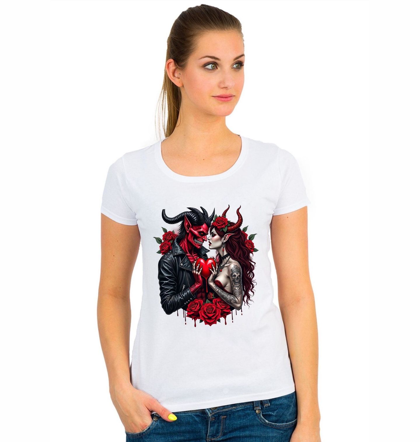 Dámské tričko Pekelná Láska. Láska, která pálí až do pekla! Tento výrazný motiv spojuje čerta a krásnou démonku v žhavém objetí, kde se láska mísí s temnotou. Ideální pro fanoušky gotiky, tetování a temné romantiky. Láska, čert a špetka satana v jednom stylovém designu, který přitáhne pohledy a odhalí váš vnitřní oheň.