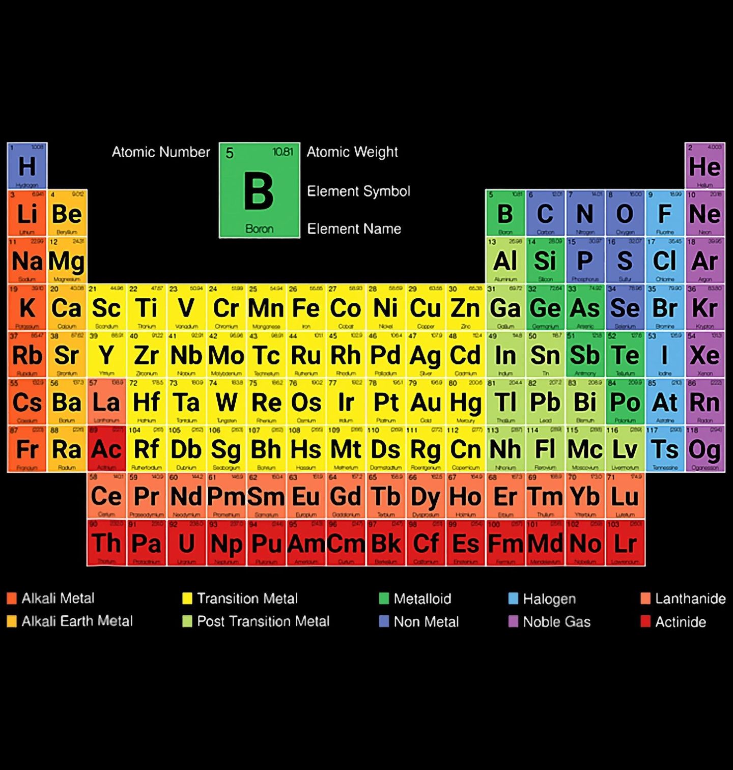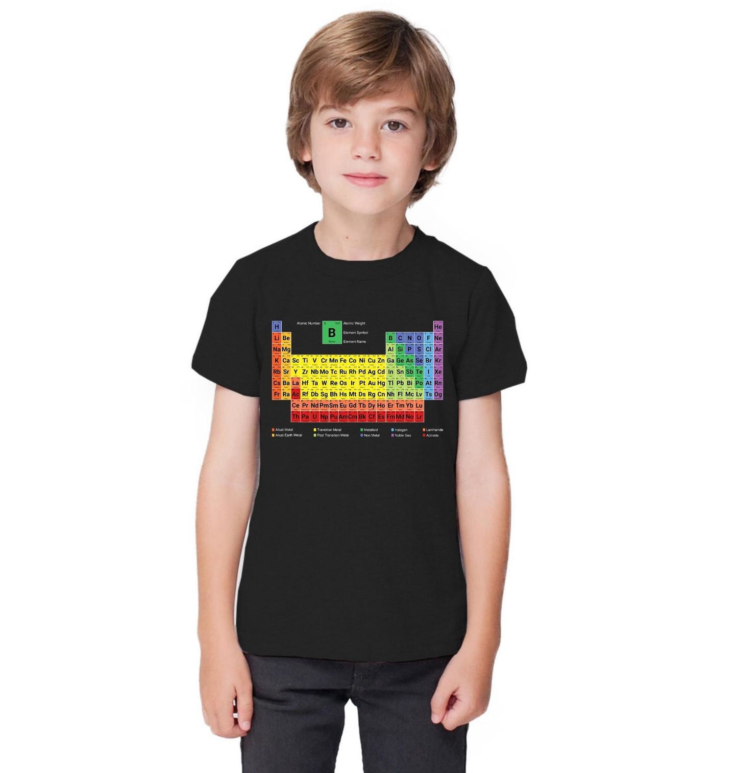 Dětské tričko Periodická Tabulka Prvků. Stylový a přehledný motiv chemie zobrazující kompletní periodickou tabulku v moderním barevném designu. Každý prvek má svou barvu podle skupiny – od alkalických kovů až po vzácné plyny, takže motiv je nejen krásný, ale i vzdělávací. Perfektní pro studenty, učitele, laboranty, fanoušky vědy.