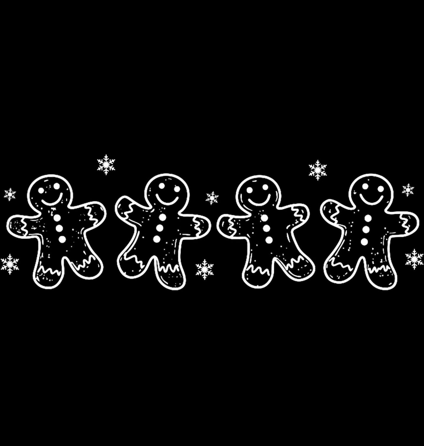 Dámské tričko Perníčci ve Sněhu. Usměvavý perníček v černobílém provedení je vyobrazen v řetězu spolu s padajícími sněhovými vločkami. Tento design dokonale vystihuje Vánoce – radost, pohodu a klasické cukroví, které k nim neodmyslitelně patří.