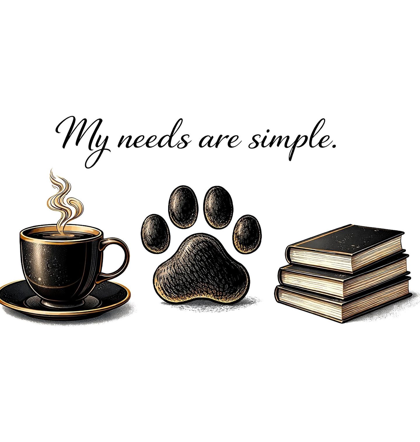 Dámské tričko Pes, Káva a Knihy. Tento elegantní motiv ukazuje, že člověk ke štěstí nepotřebuje mnoho – stačí klid, pohoda a přítomnost svého čtyřnohého mazlíčka. Nápis “My needs are simple” v překladu znamená “Moje potřeby jsou jednoduché”.
