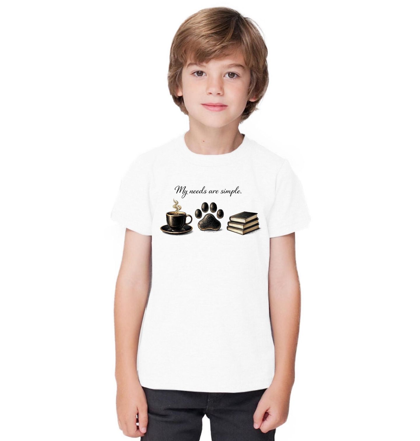 Dětské tričko Pes, Káva a Knihy. Tento elegantní motiv ukazuje, že člověk ke štěstí nepotřebuje mnoho – stačí klid, pohoda a přítomnost svého čtyřnohého mazlíčka. Nápis “My needs are simple” v překladu znamená “Moje potřeby jsou jednoduché”.