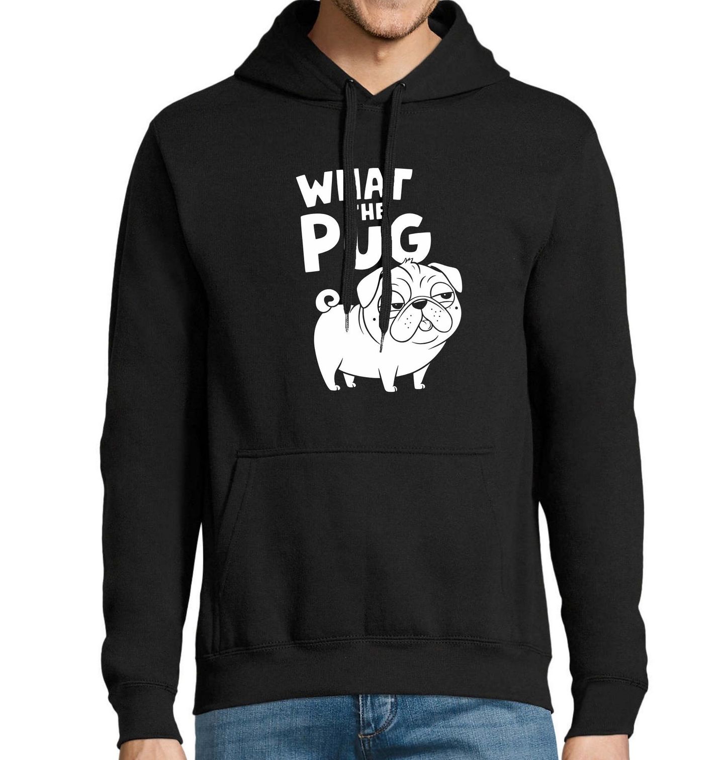 Pánská mikina Pes Mops What The Pug. Pro všechny milovníky psů a zvlášť tohoto roztomilého plemene – pes mops (anglicky pug). Hravý slogan "What the Pug?!" je parodií na známý anglický výraz “What the fuck”. Skvělý dárek pro pejskaře, milovníky mopslíků i každého, kdo má smysl pro humor!