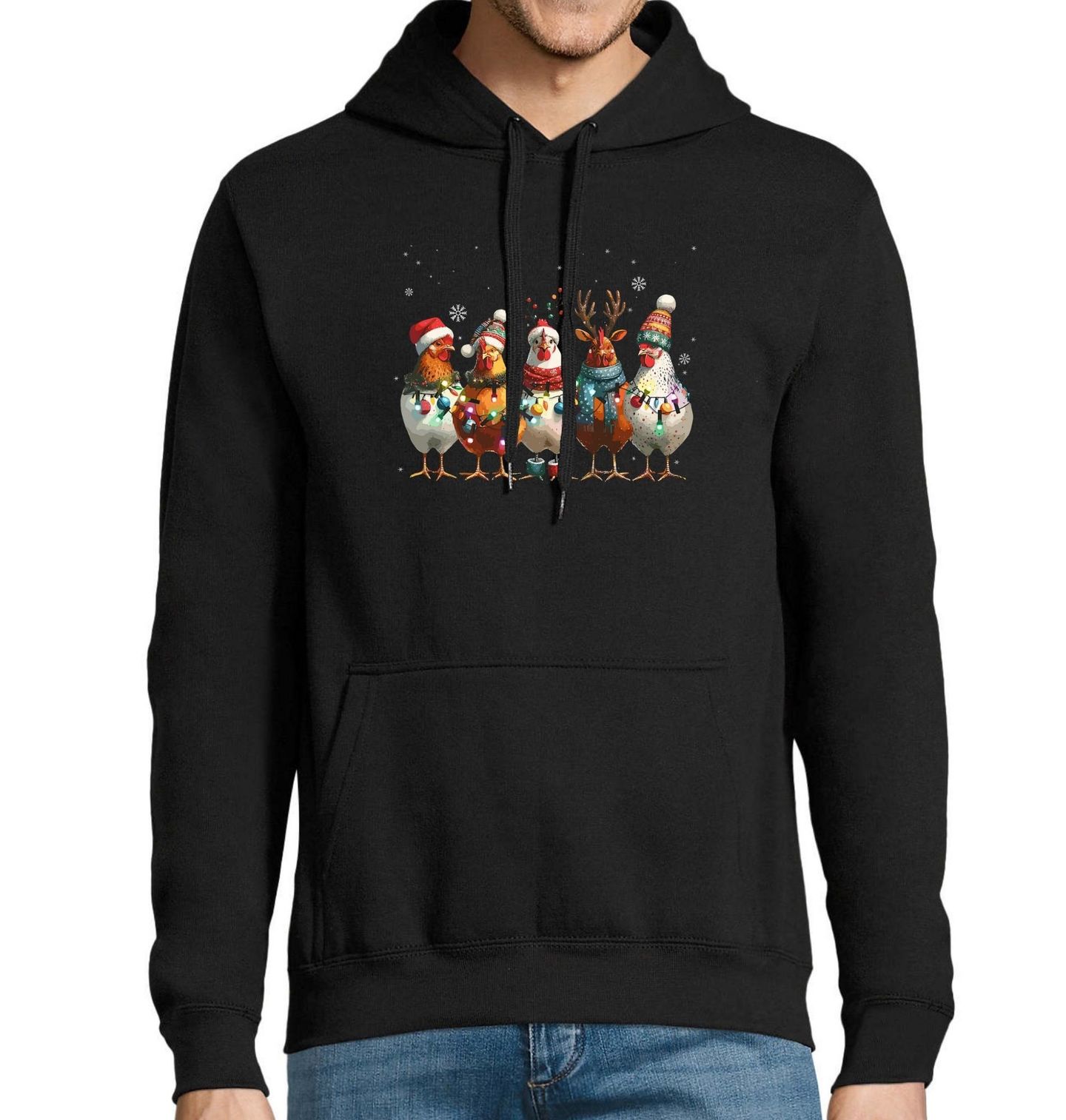 Pánská mikina Pět Vánočních Slepic. Vtipný motiv s pěti slepicemi oblečenými do vánočních čepic, šál a zimních doplňků, ozdobenými barevnými světýlky a sněhovými vločkami. Tento originální design přináší Vánoce do každého detailu a potěší všechny, kdo mají rádi zábavné a netradiční motivy.