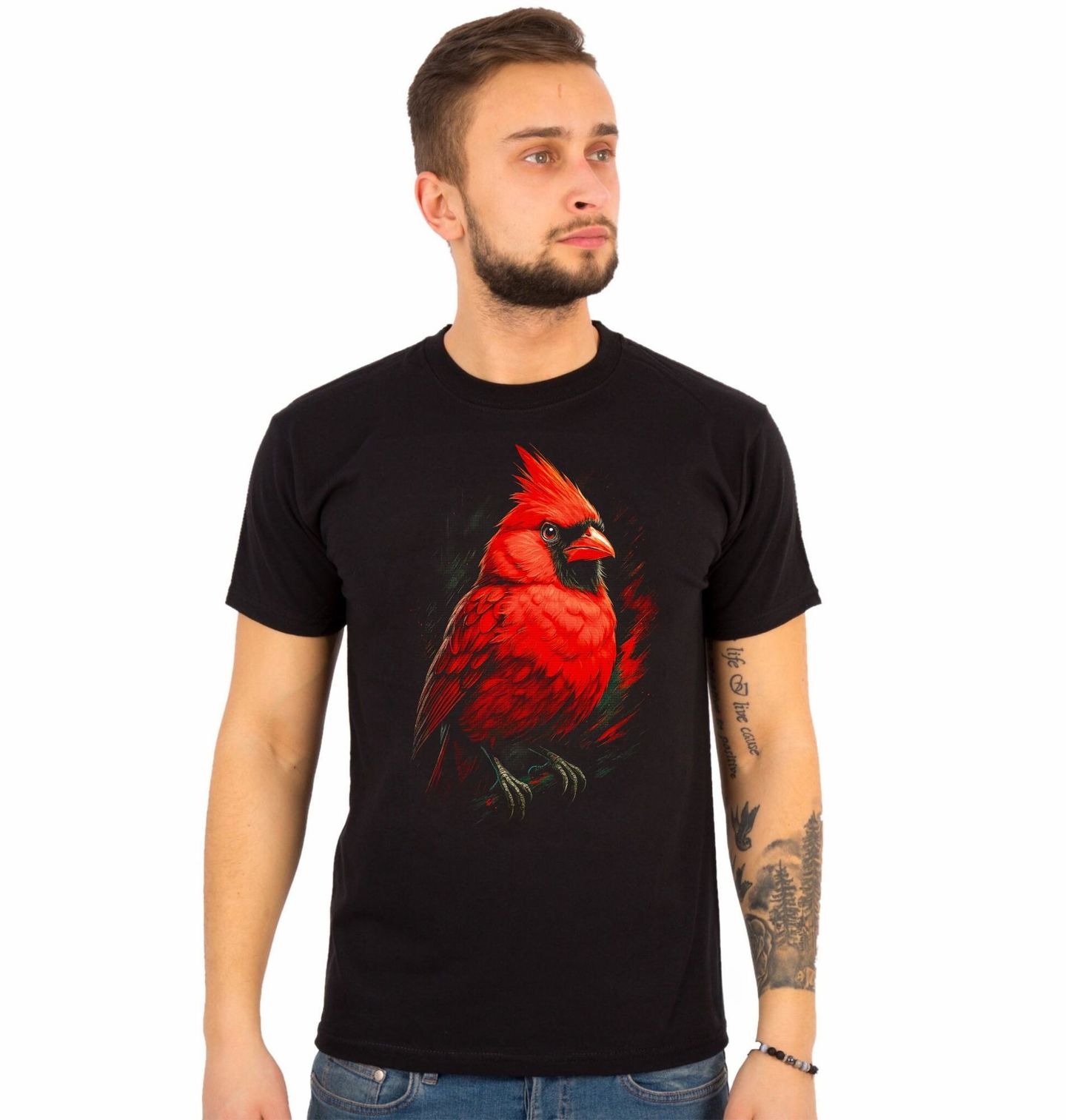Pánské tričko Pěvec Kardinál červený. Tento výrazný pták kardinál červený (Cardinalis cardinalis), jeden z nejikoničtějších pěvců Severní Ameriky. Sytě červené peří, výrazná chocholka a kontrastní černá maska kolem zobáku vytvářejí nezaměnitelný vzhled, který symbolizuje sílu, odvahu a vášeň.