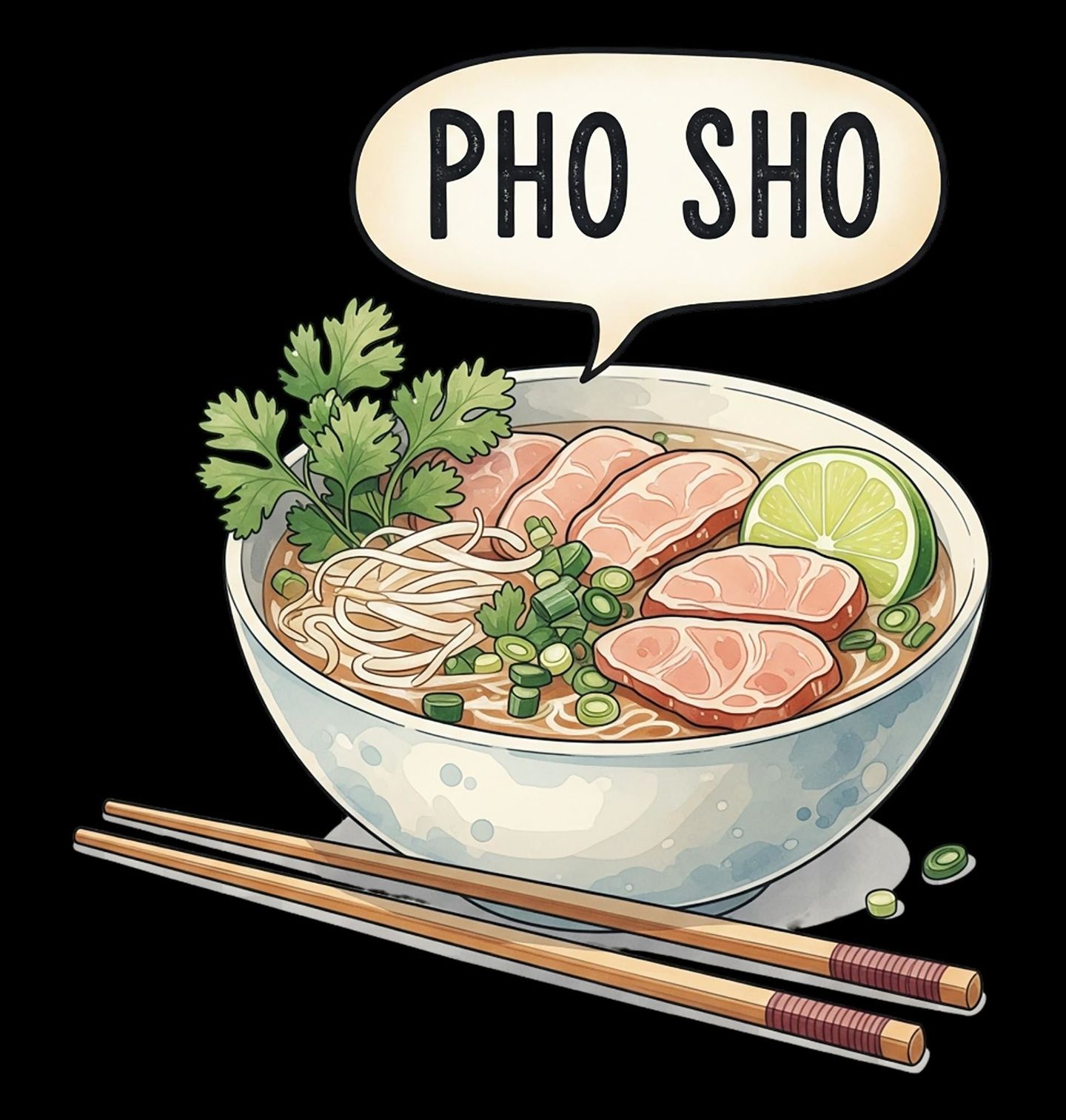 Pánské tričko Pho Sho Jistota Chutí. Minimalistický design s miskou pho a textem „Pho Sho“, což znamená „For sure“ (určitě / jasně). Motiv vyjadřuje jistotu dobré chuti a lásku k vietnamské kuchyni. Detailní ilustrace s bylinkami a nudlemi dodává autentický vzhled. Tento design je ideální pro každého foodie nadšence.