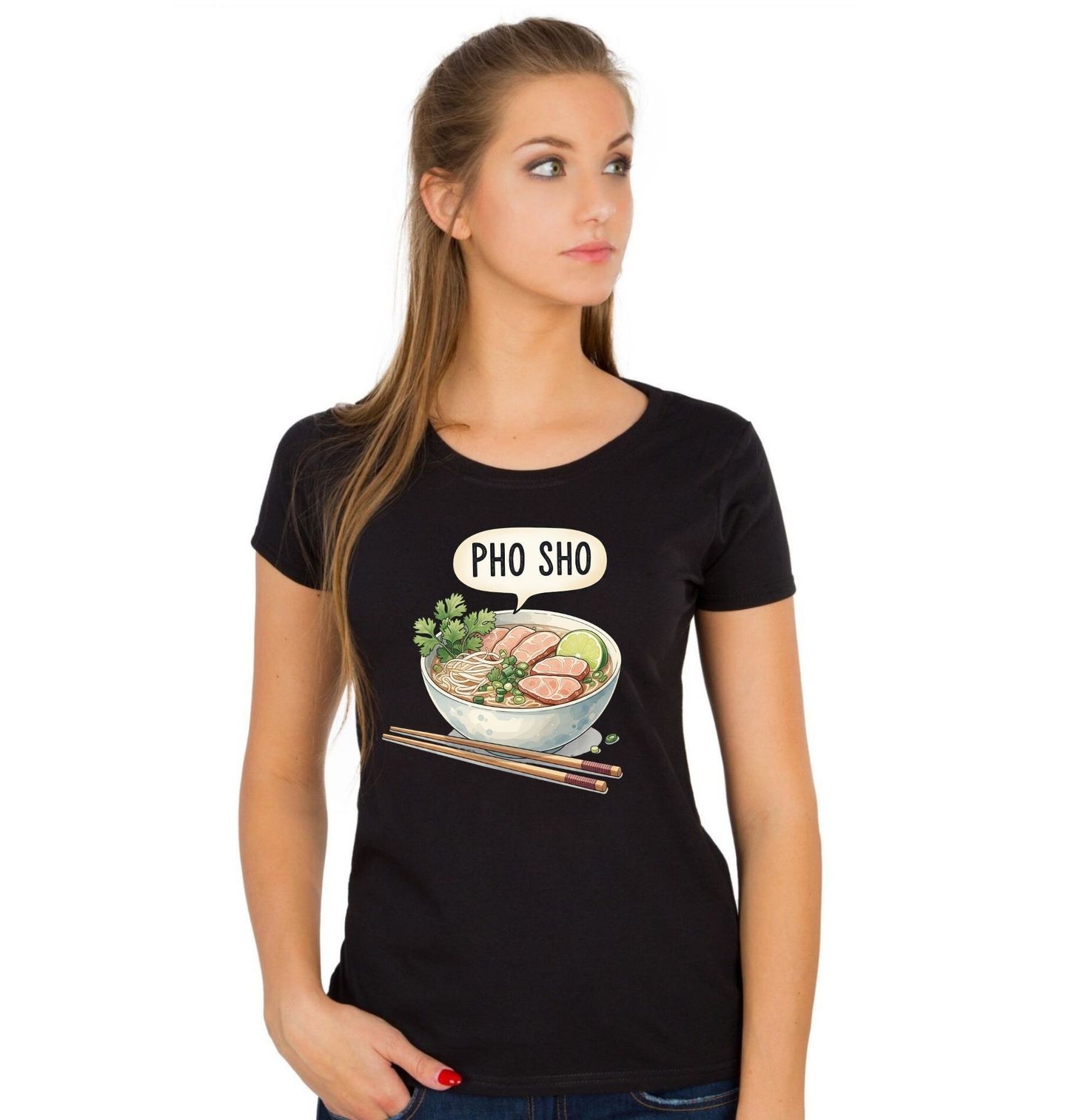 Dámské tričko Pho Sho Jistota Chutí. Minimalistický design s miskou pho a textem „Pho Sho“, což znamená „For sure“ (určitě / jasně). Motiv vyjadřuje jistotu dobré chuti a lásku k vietnamské kuchyni. Detailní ilustrace s bylinkami a nudlemi dodává autentický vzhled. Tento design je ideální pro každého foodie nadšence.