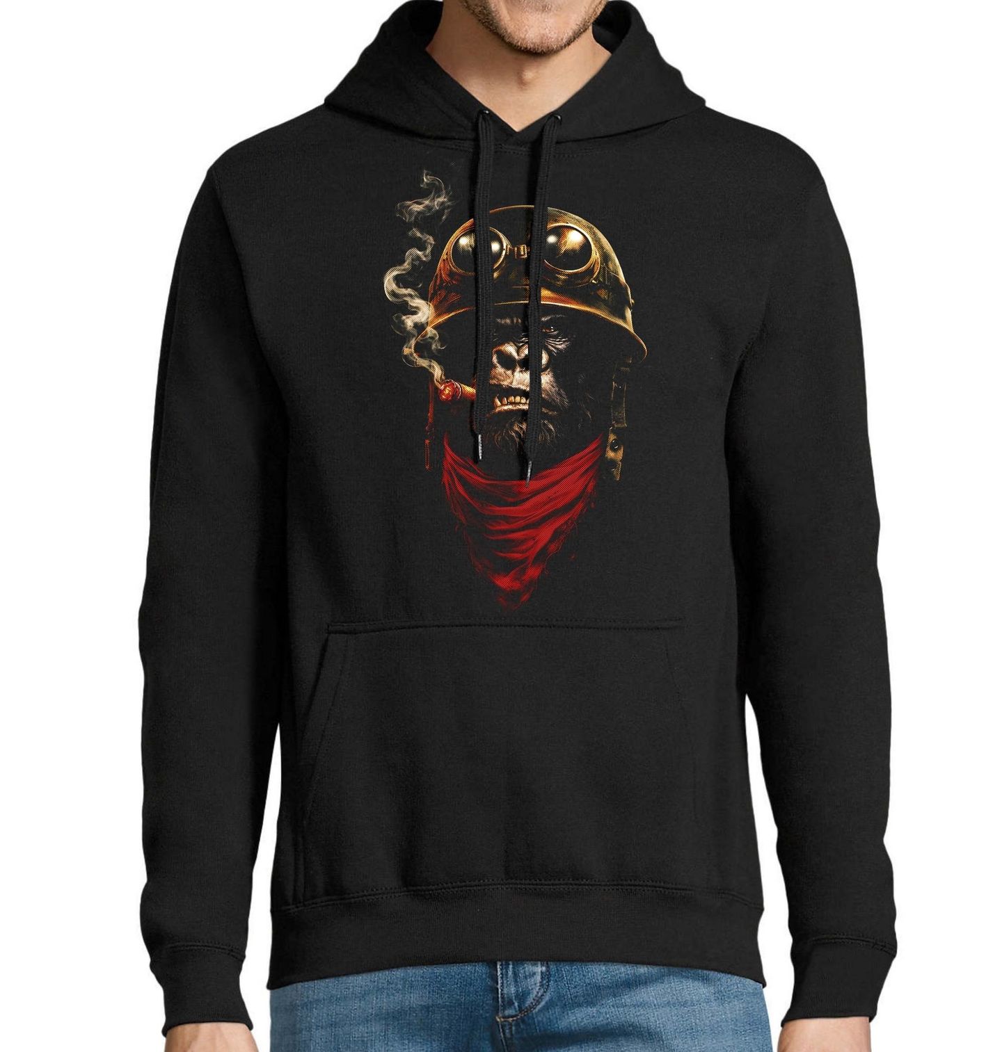 Pánská mikina Pilot Gorila s Doutníkem. Drsný a originální motiv, který spojuje sílu, styl a dobrodružství. Dominantní opice v pilotní helmě s brýlemi a doutníkem působí jako nekompromisní letec, který má vše pod kontrolou. Tento design je ideální pro všechny, kdo milují svobodu, adrenalin a jedinečný vzhled. Zobrazená opice připomíná gorilu, která je symbolem síly a dominance, zde však v netradiční roli – jako pilot připravený vzlétnout do akce.