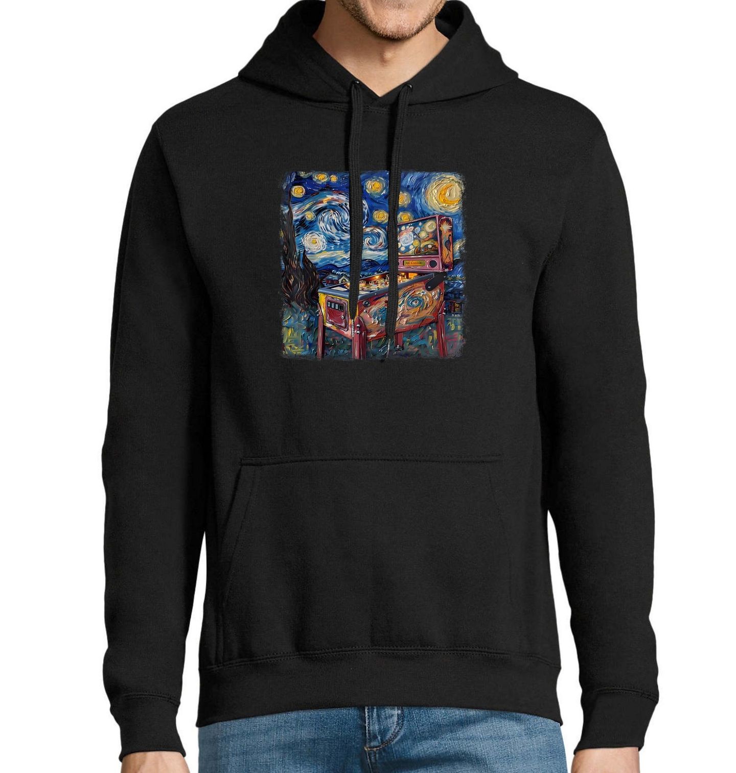 Pánská mikina Pinball Automat ve Hvězdné noci. Originální retro tričko s motivem pinballového automatu zasazeného do slavného obrazu „Hvězdná noc“ od Vincenta van Gogha. Ideální kousek pro milovníky umění i nostalgického hraní. Když se klasika výtvarného světa potká s arkádovou legendou, vzniká neodolatelná kombinace.