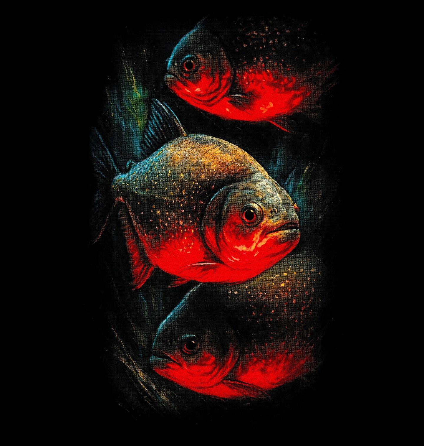 Dámské tričko Piraňa červená. Výrazný a temně laděný motiv zobrazuje piraňu (Pygocentrus nattereri), legendárního sladkovodního dravce amazonských řek. Typické stříbřité tělo s kontrastním rudým břichem a ostrý pohled dokonale vystihují nekompromisní povahu této ryby. Ideální volba pro každého rybáře, který obdivuje dravé ryby a rybaření.