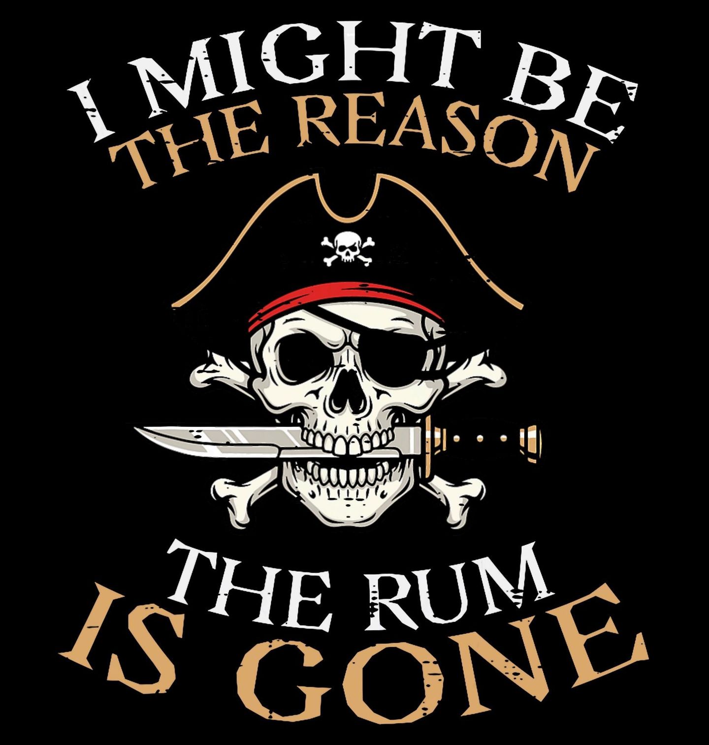 Dámské tričko Pirát Možná jsem důvod, proč je rum pryč. Tento vtipný a stylový motiv potěší každého, komu je pirát symbolem svobody, dobrodružství a humoru. Na obrázku je pirátská lebka s páskou přes oko a nožem v ústech, doplněná textem „I MIGHT BE THE REASON THE RUM IS GONE“.