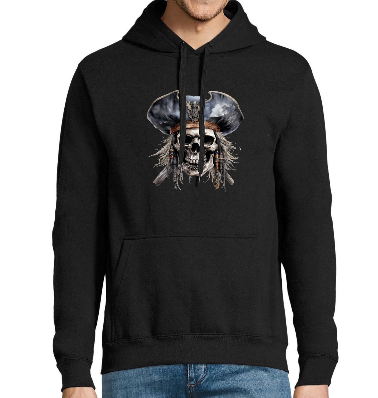 Pánská mikina Pirátská Lebka z Temného Moře. Kostlivec, kterého by nechtěl potkat ani ten nejotrlejší námořník. S detailně vykresleným pirátským kloboukem a doplňky působí jako ztracený kapitán dávno potopené lodi. Motiv spojuje temnotu, dobrodružství a legendy o pirátech, kteří se nikdy nevzdali – ani po smrti. Ideální pro každého rebela s láskou k moři a lebkám.