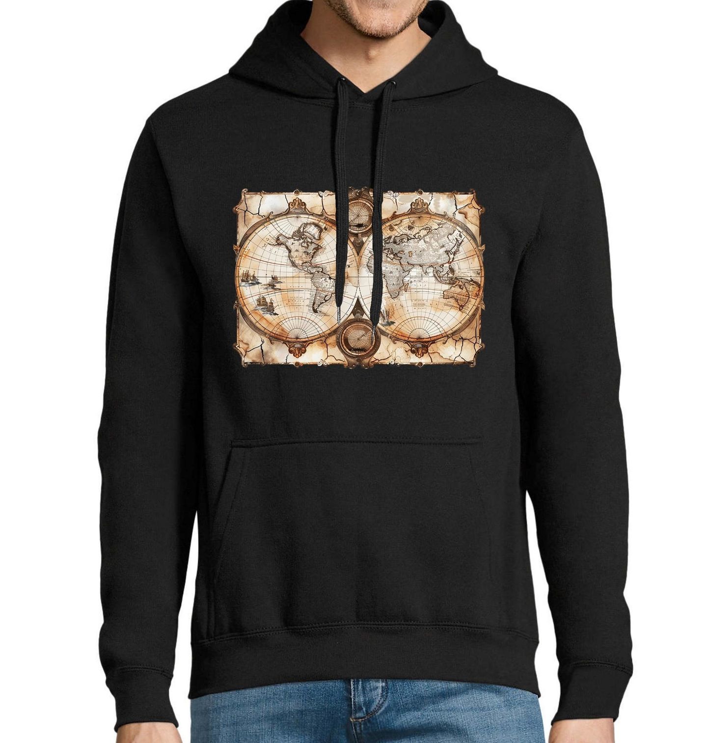 Pánská mikina Pirátská Mapa Světa. Vydej se na cestu plnou dobrodružství, objevů a dávných legend. Tento motiv v sobě spojuje kompas jako symbol správného směru, historickou mapu světa plnou tajemství a atmosféru, kterou milují piráti i všichni milovníci dobrodružství. Design připomíná staré námořní mapy, podle kterých se plánovalo cestování za pokladem, svobodou a neznámem.