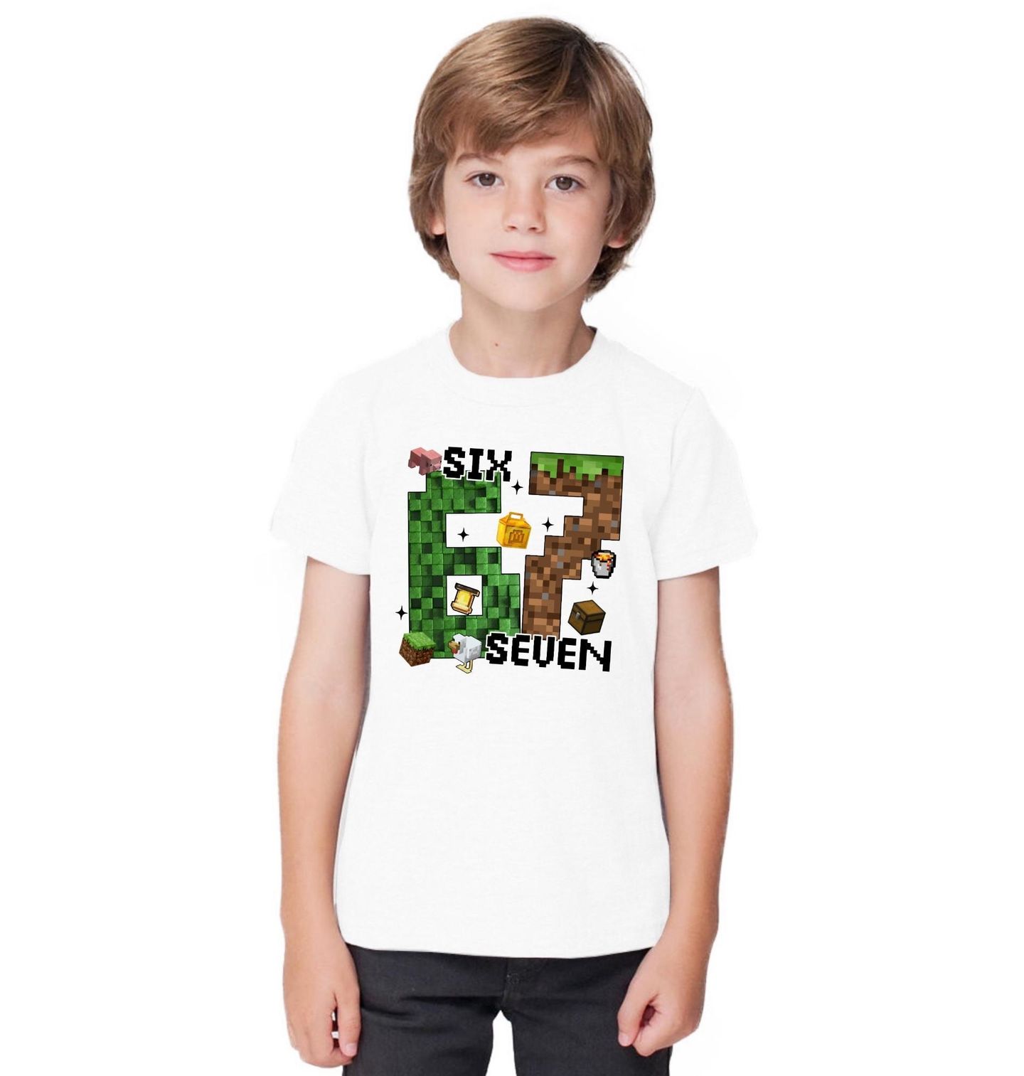 Dětské tričko Pixelový Brainrot Six Seven. Motiv číslo inspirovaný herním světem s textem „Six Seven“. Obsahuje prvky jako bloky a postavy. Design vhodný pro milovníky brainrotů a videoher.