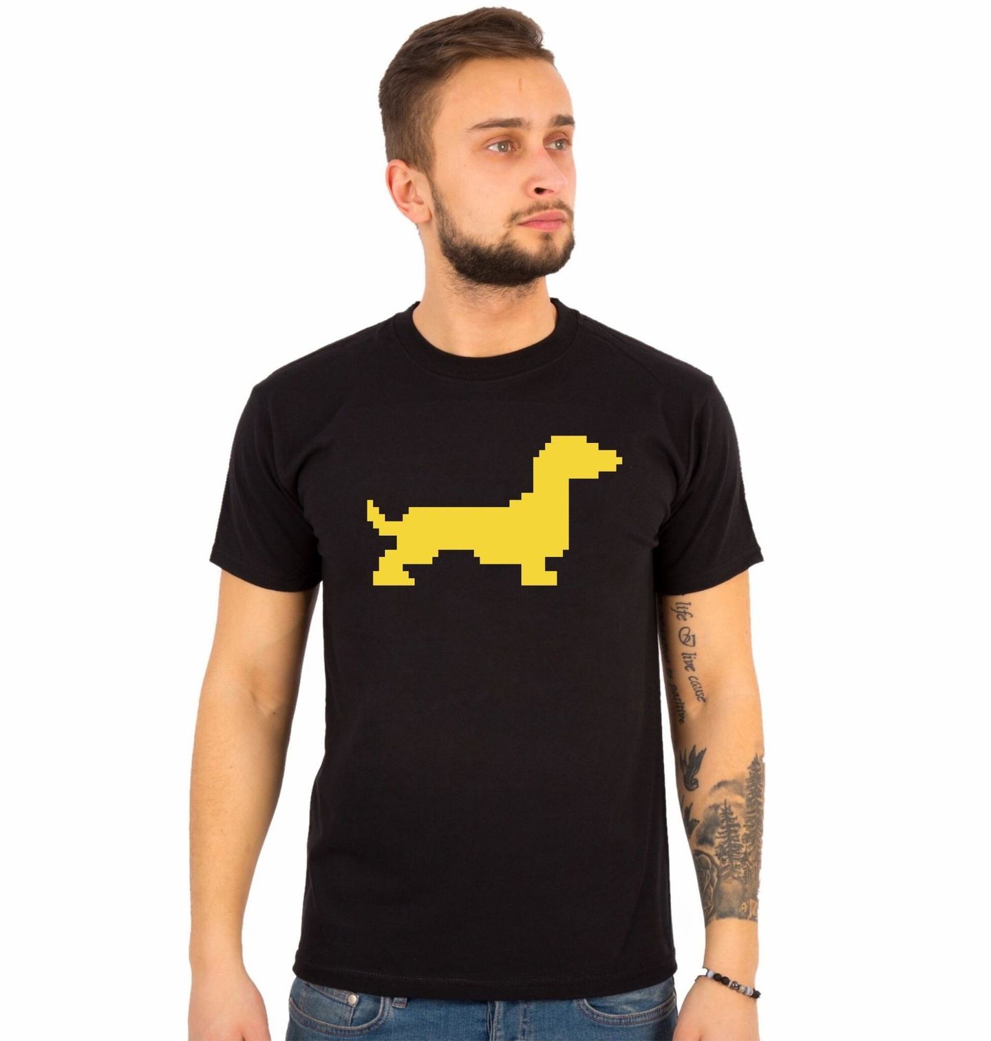 Pánské tričko Pixelový Jezevčík 80s. Minimalistický motiv, který na první pohled jasně říká, o co jde. Stylizovaný pes v pixelovém provedení tvoří jednoduchou, ale výraznou siluetu jezevčíka na kontrastním pozadí. Ideální volba pro každého pejskaře, který má rád čistý design, hravost a trochu retro stylu.